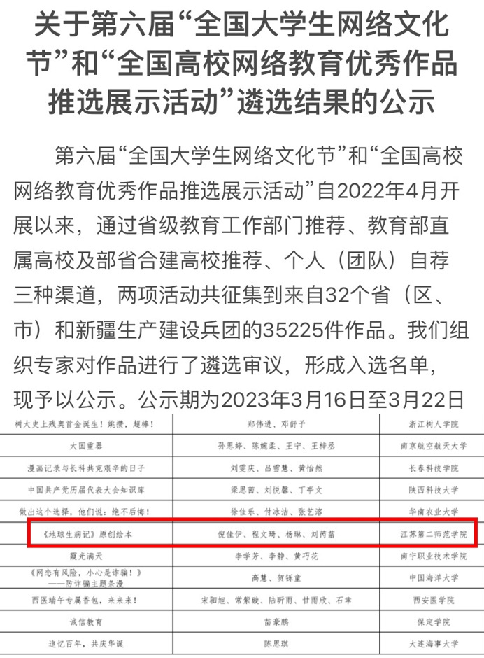 近日,由教育部思想政治工作司、中央网信办网络社会工作局联合举办的第六届“全国大学生网络文化节”获奖名单公布,我校党委学工部、生化学院遴选、报送的参赛作品《地球生病记》获其他创新类作品优秀奖。