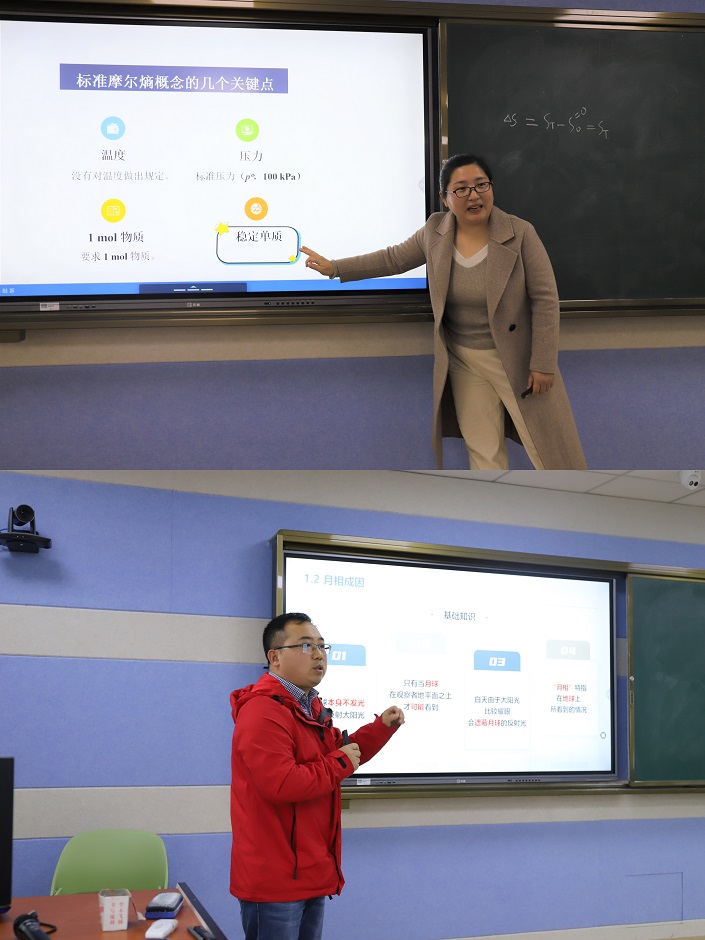 理科组由教务处副处长王玉玺主持,我校第九届“教学十佳”获得者杨慧、南京师范大学地理科学学院张志刚老师分别进行了课堂教学展示。杨慧老师示范课内容为《热力学第三定律和标准熵》,张志刚老师示范课内容为《月相》。