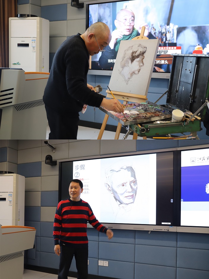 艺体组由教学质量检测与评估处副处长吴晋主持,我校第九届“教学十佳”获得者孙仕荣、南京艺术学院美术学院邢健健老师分别进行了课堂教学展示。孙仕荣老师示范课内容为《油画头像写生步骤》,邢健健老师示范课内容为《对画:向大师致敬》。