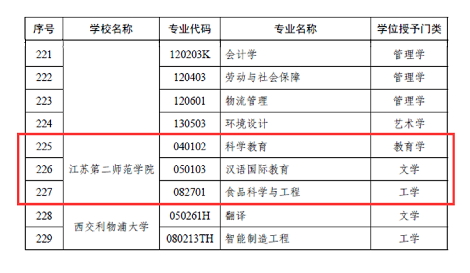 日前,江苏省学位委员会、省教育厅发布《省学位委员会省教育厅关于公布 2023年度新增学士学位授权专业名单的通知》(苏学位字函〔2023〕1 号),我校科学教育、汉语国际教育和食品科学与工程三个专业顺利通过学士学位授权专业审核,获得学士学位授予权。