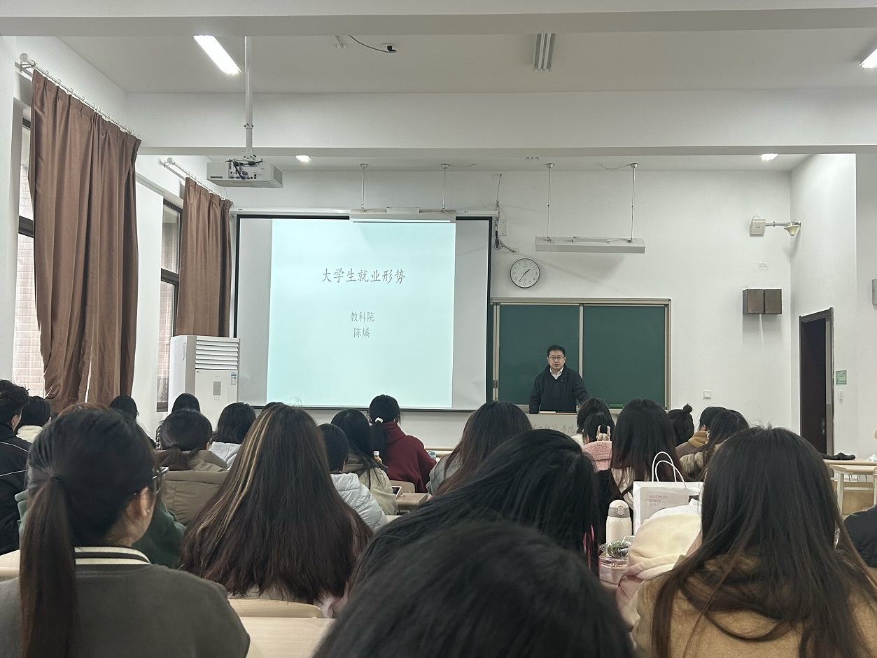 陈燏从当前大学生面临的严峻就业形势切入,通过数据、图表等方式,直观分析了近20年以来全国高校毕业生数量逐年增长的现实情况。接着,向同学们分析了我院小学教育、应用心理学、教育技术学三个专业,在江苏省内不同地区的岗位需求变化,帮助同学们明晰地区选择。同时,结合我院毕业生历年就业去向,简要介绍了各专业考研、各地区考公等情况。最后,他给同学们提出两点建议,一是抓住机会,就业竞争是非常激烈的,每一次机会都难得可贵,在锻炼中才能不断成长;二是持之以恒,求职探索的道路是艰苦的,只有坚持不懈、努力奋斗,才能到达成功的彼岸。