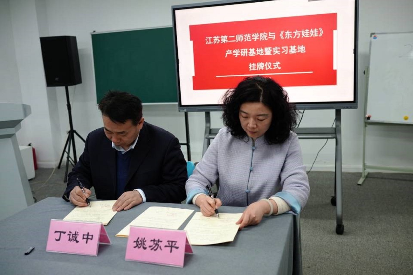 双方就助力人才培养、开展文学研究与实践、推动长期项目合作等进行深入交流并签署合作协议,在东方娃娃杂志社成立“母语教育与传播研究产学研基地”,并挂牌“江苏第二师范学院产学研合作基地”“江苏第二师范学院大学生实践基地”。