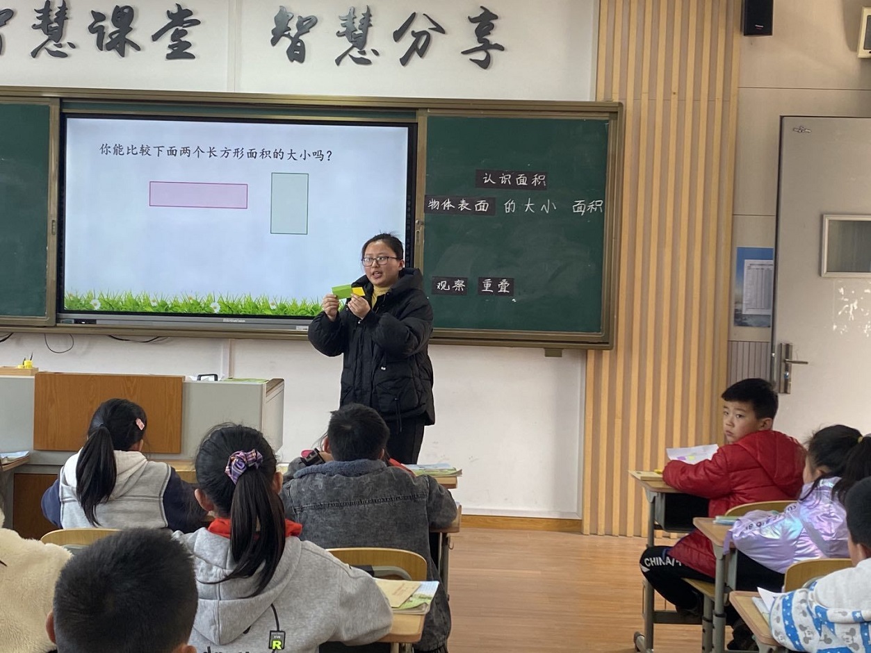 陆郎中心小学韦啸露老师执教了《认识面积》。她从学生的已有经验入手,通过数学书的表面与黑板的表面引入面积的概念,在对比操作中,学生感悟到了面积的大小。