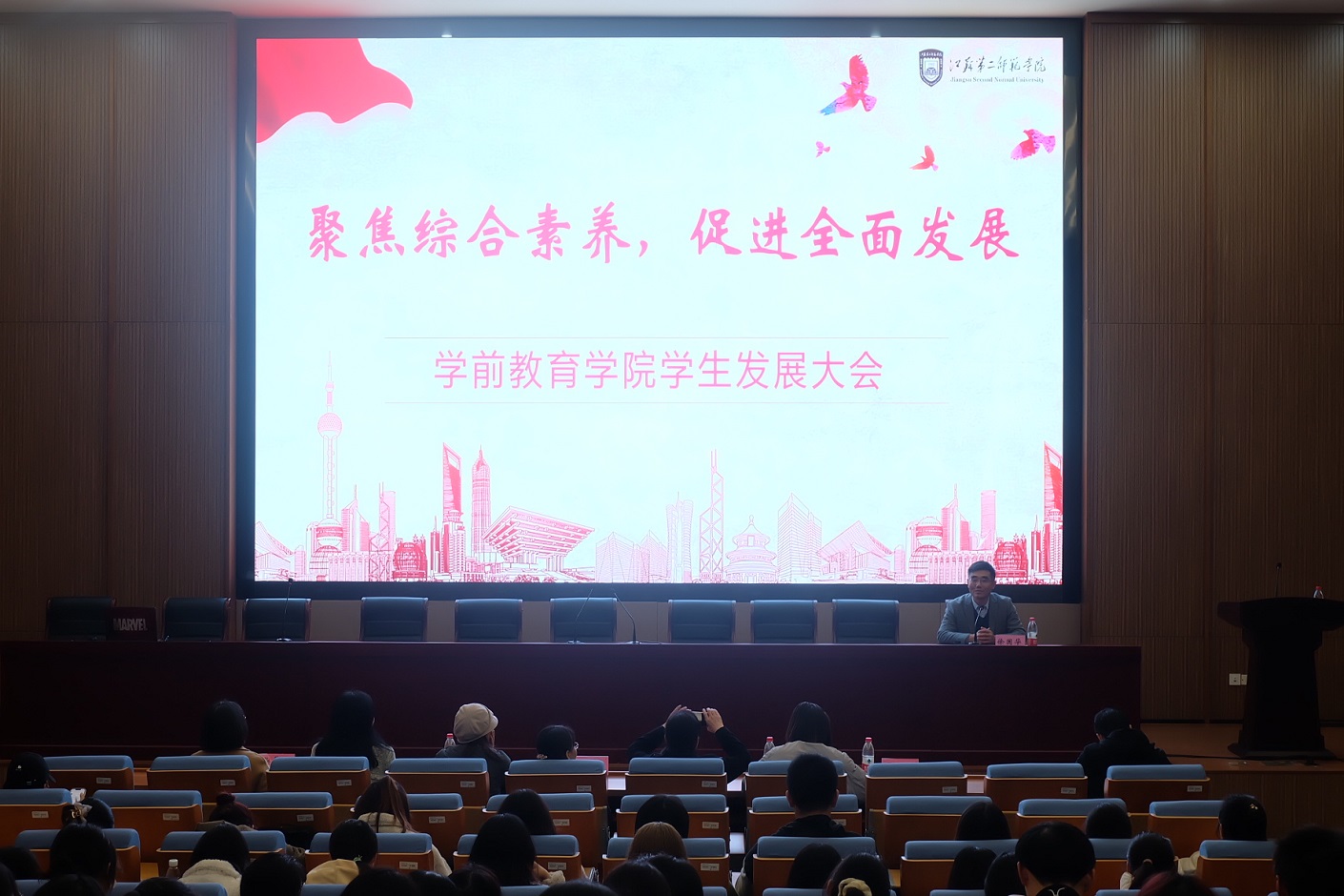 新的征程,展望未来。为帮助学院学生规划未来,明确发展方向,近日,学前教育学院“聚焦综合素养,促进全面发展”学生发展大会在学校图书馆报告厅中举行。江苏第二师范学院校长徐国华、国际合作与交流处综合科科长罗丽冬,学院党总支书记宋学军、院长田燕、副书记王艳、副院长吴巍莹、副院长郭莉以及学前教育学院部分教师代表、学生代表出席了本次会议。大会由宋学军主持。