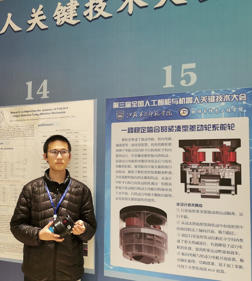 会议期间,参会师生就机器人技术发展趋势和最新研究成果等与参会专家学者进行了广泛而深入地探讨。梅轩宁的科技作品——《一种稳定啮合的紧凑型差动轮系舵轮》在大会现场进行了实物展示与交流,收获颇丰。