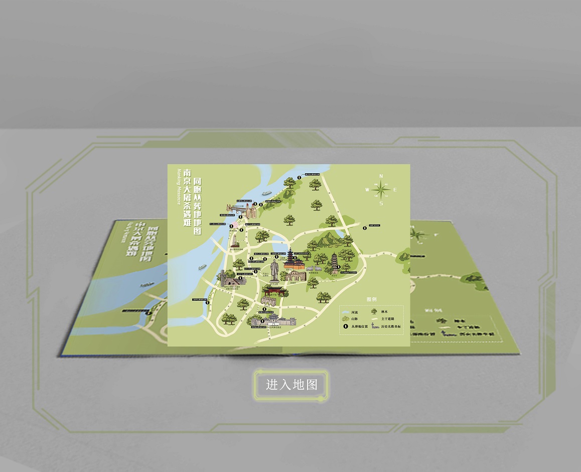 志愿服务活动依托学院教师的相关研究课题,以丛葬地历史文化为主线,深挖历史真实事件,借助数字媒体艺术专业优势,将19个丛葬地遗址位置、纪念碑立碑时间、碑文等基础性资料转化为数字数据;绘制丛葬地手绘地图,加入红色文化地标性建筑、重点文物保护单位、爱国主义教育示范基地、国家级抗战纪念设施、遗址等周边相关地标;基于AR技术制作青少年地图绘本,同时运用AR交互的形式,在绘本的基础上增加可互动性。