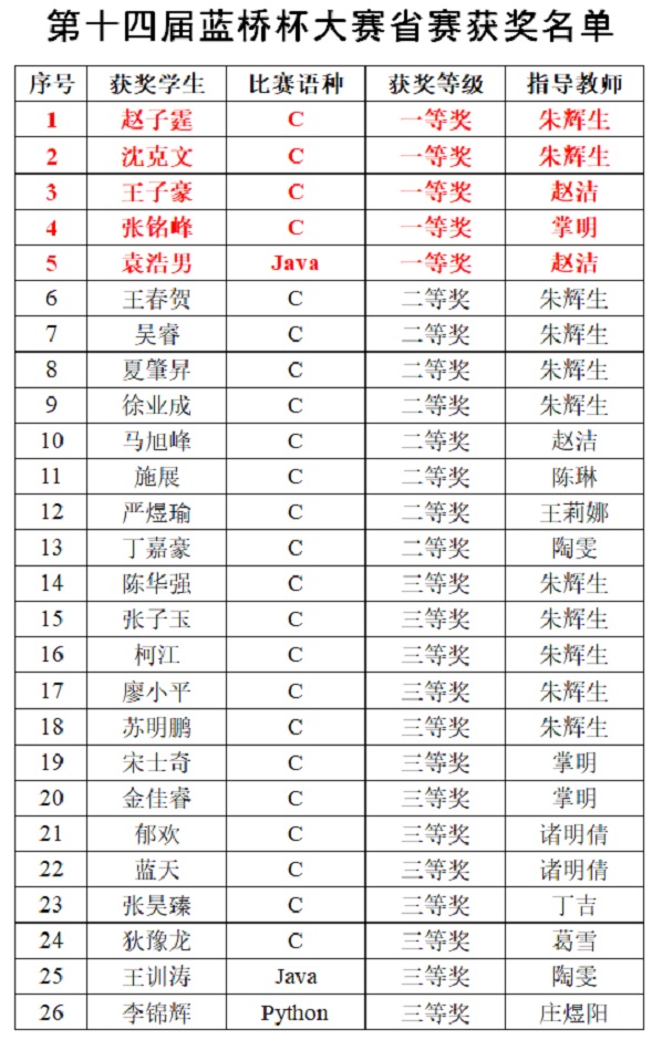 近日,第十四届蓝桥杯全国软件和信息技术专业人才大赛省赛成绩揭晓,我校学生获软件类一等奖5项、二等奖8项、三等奖13项,获得一等奖的5名同学将代表我校参加6月份举行的全国总决赛。本届赛事是我校学生自2019年参加蓝桥杯大赛以来获奖质量最高、获奖数量最多的一届,大赛成绩彰显了我校计算机科学与技术专业(国家级一流本科专业建设点、江苏高校品牌专业、江苏省本科高校卓越工程师教育培养计划2.0专业建设点)的人才培养成效。