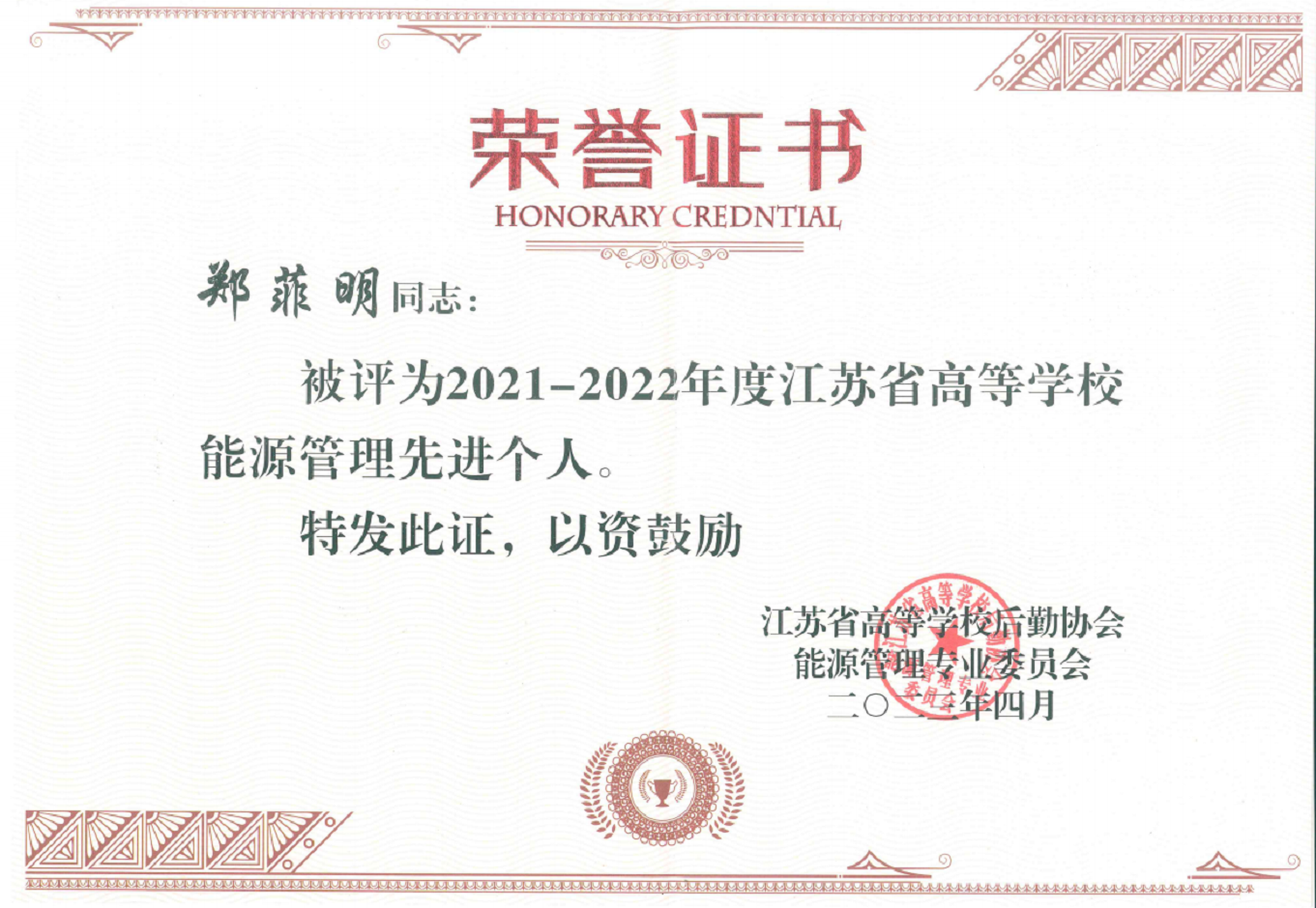 年会对2021-2022年度20家能源管理先进单位和30名先进个人进行表彰。后勤与基建处郑菲明获得“先进个人”表彰。