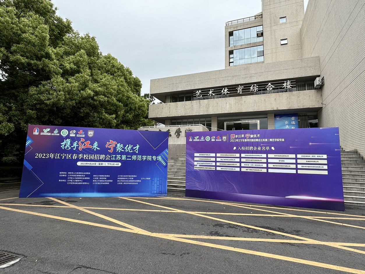 为搭建人才供需对接平台,促进毕业生更高质量更充分就业,4月24日下午,“携手江来 宁聚优才”2023年江宁区春季校园招聘会-江苏第二师范学院专场在我校草场门校区体育馆举办。此次活动由江宁开发区管委会联合江宁区人社局等单位主办,江苏第二师范学院招就处承办。