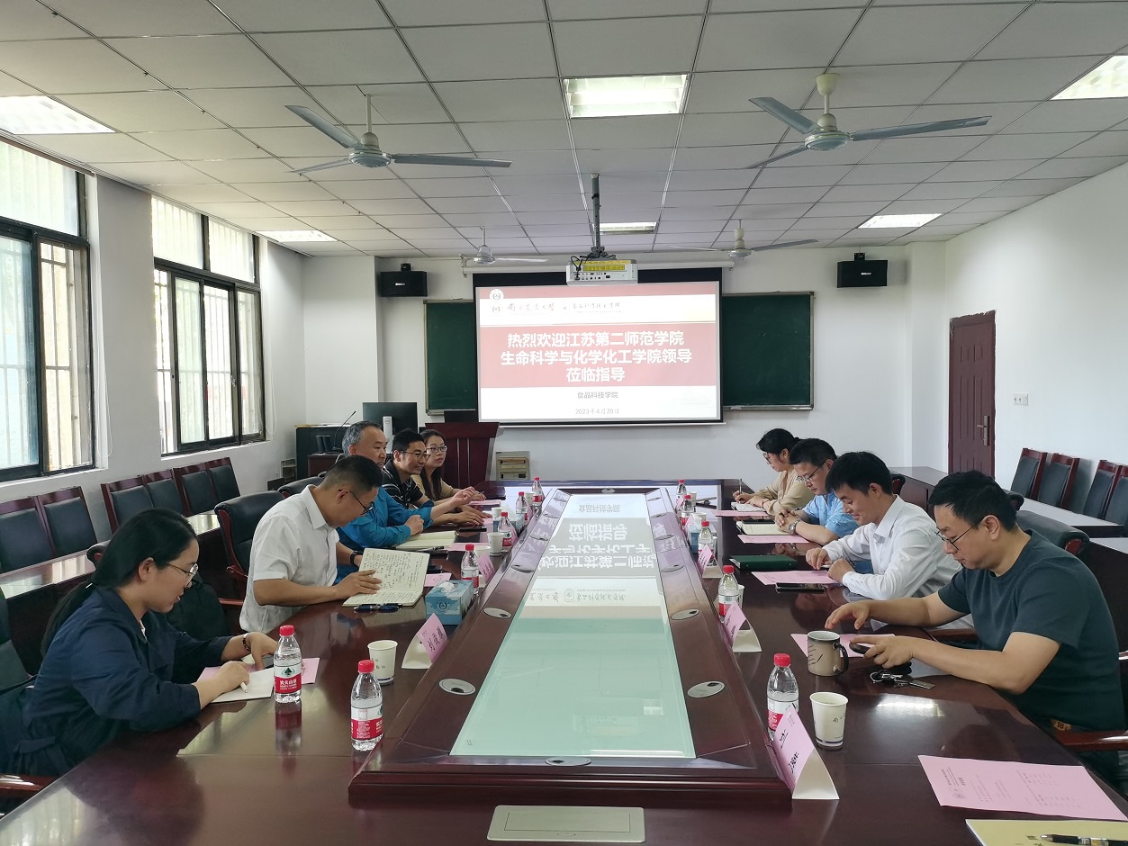 为提升生化学院学科建设、专业发展、人才培养水平,特别为专业硕士点的申报积累一手经验,2023年4月20日,生化学院院长蒋功成、党总支书记朱学伸、副院长丁正峰、吕蓓副教授和刘俊雅博士等一行五人赴南京农业大学食品科技学院交流考察。南京农业大学食品科技学院院长李春保、副院长金鹏、副院长李伟、办公室主任刘燕、学科秘书董洋给予热情接待。