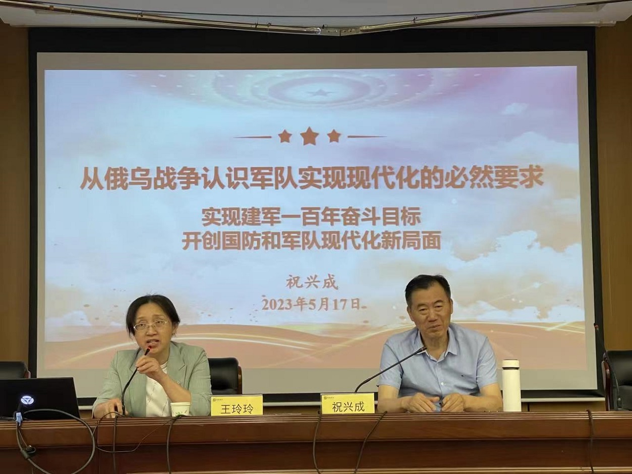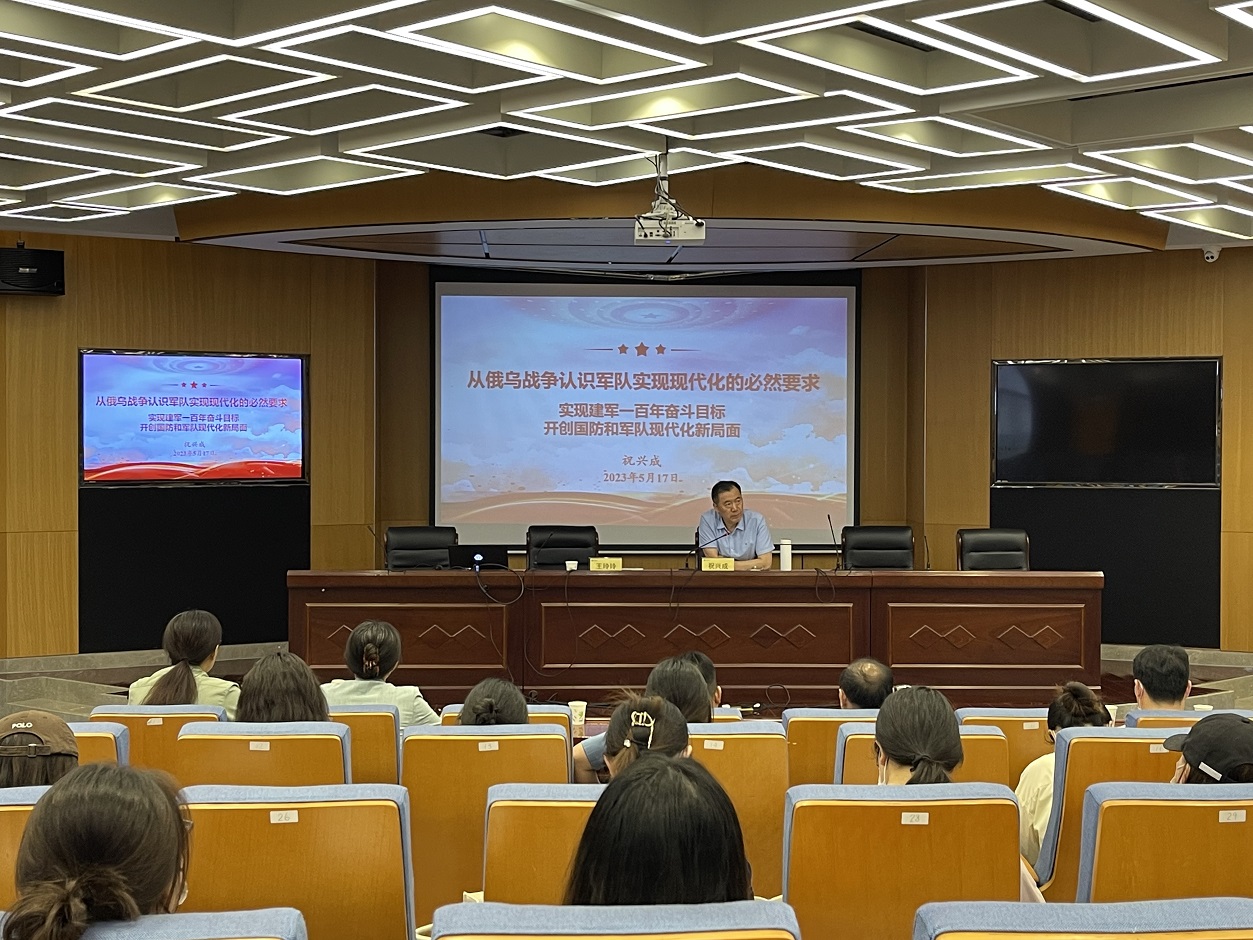 祝校长谈到要正确看待俄乌战争,他概述了俄乌战争的基本情况,分析了民族起源与宗教信仰、地缘政治背景、北约与俄罗斯的冲突和对抗等问题,深刻分析了俄乌战争给我们的启示。进而,祝校长解读了如期实现建军一百年奋斗目标的原因,带领同志们再次学习习近平总书记关于强军的主张和安排,国家和军队现代化“三步走”的发展战略,以及如何实现建军100年发展目标。