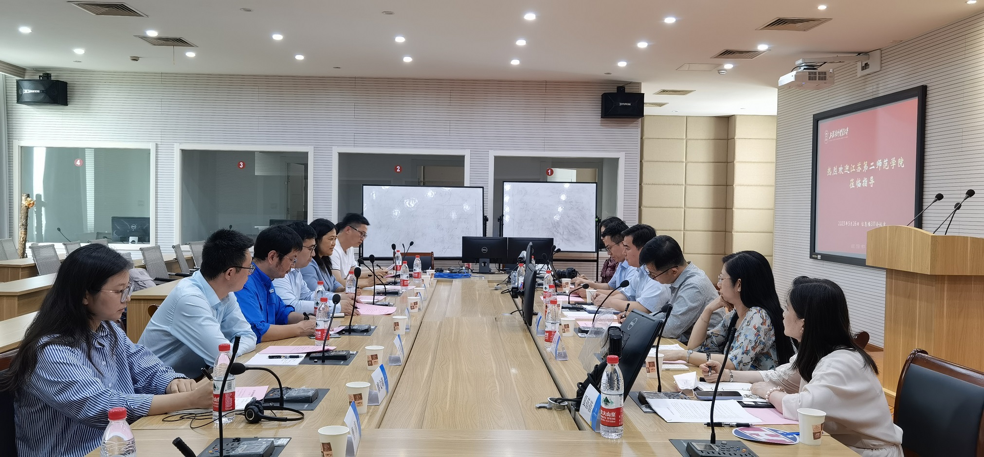 张莉介绍了江苏第二师范学院外国语学院的办学历史、专业特色和学科专业等情况。余鑫介绍了学生工作的现状特征。双方就外国语言文学学科建设、商务英语专业行业导师聘用、实践基地合作、课程思政和新文科建设的实施与评价等事宜进行了深度交流。