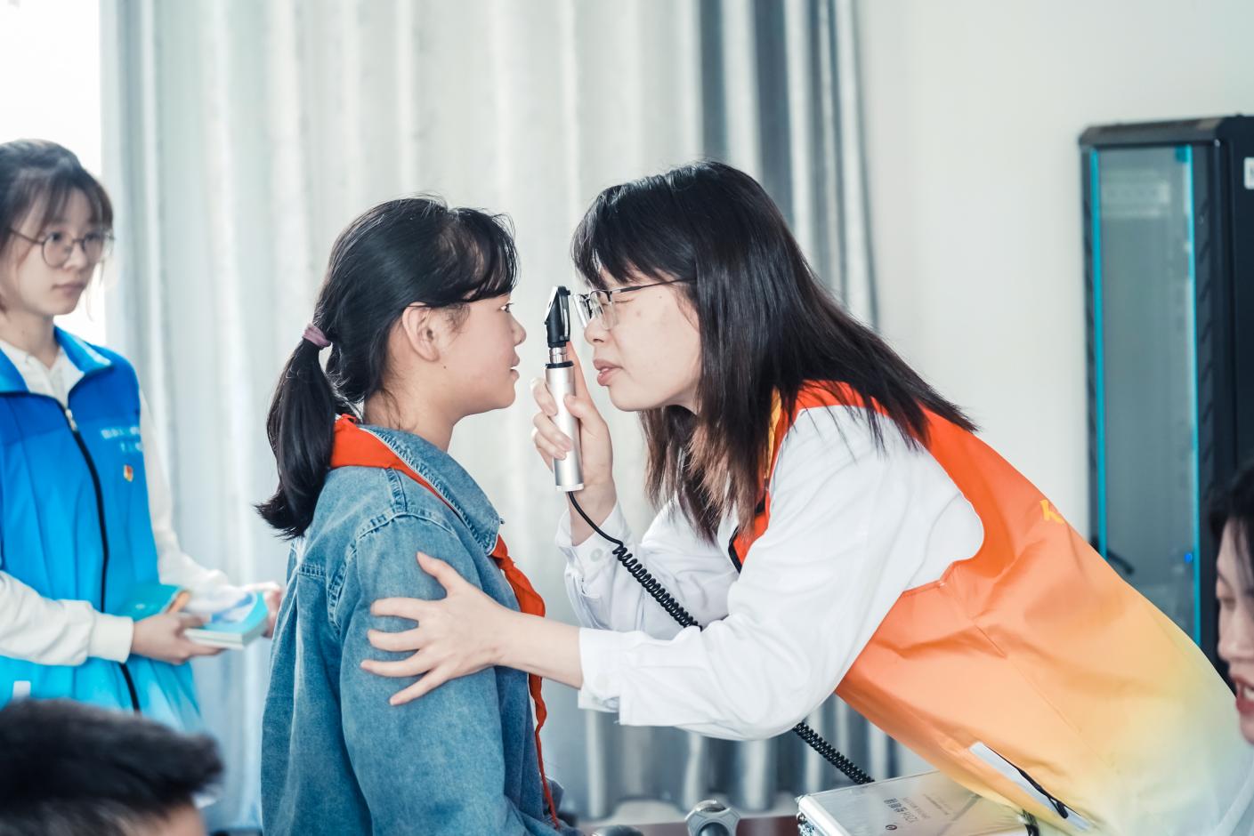 医护人员举行义诊活动,为孩子们们做眼部检查。