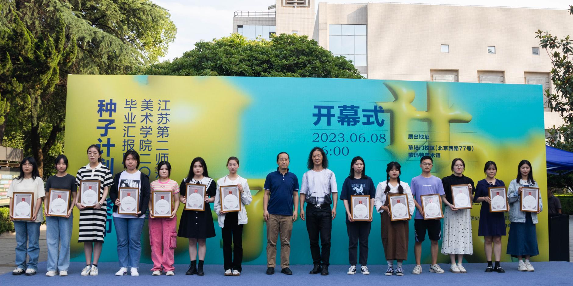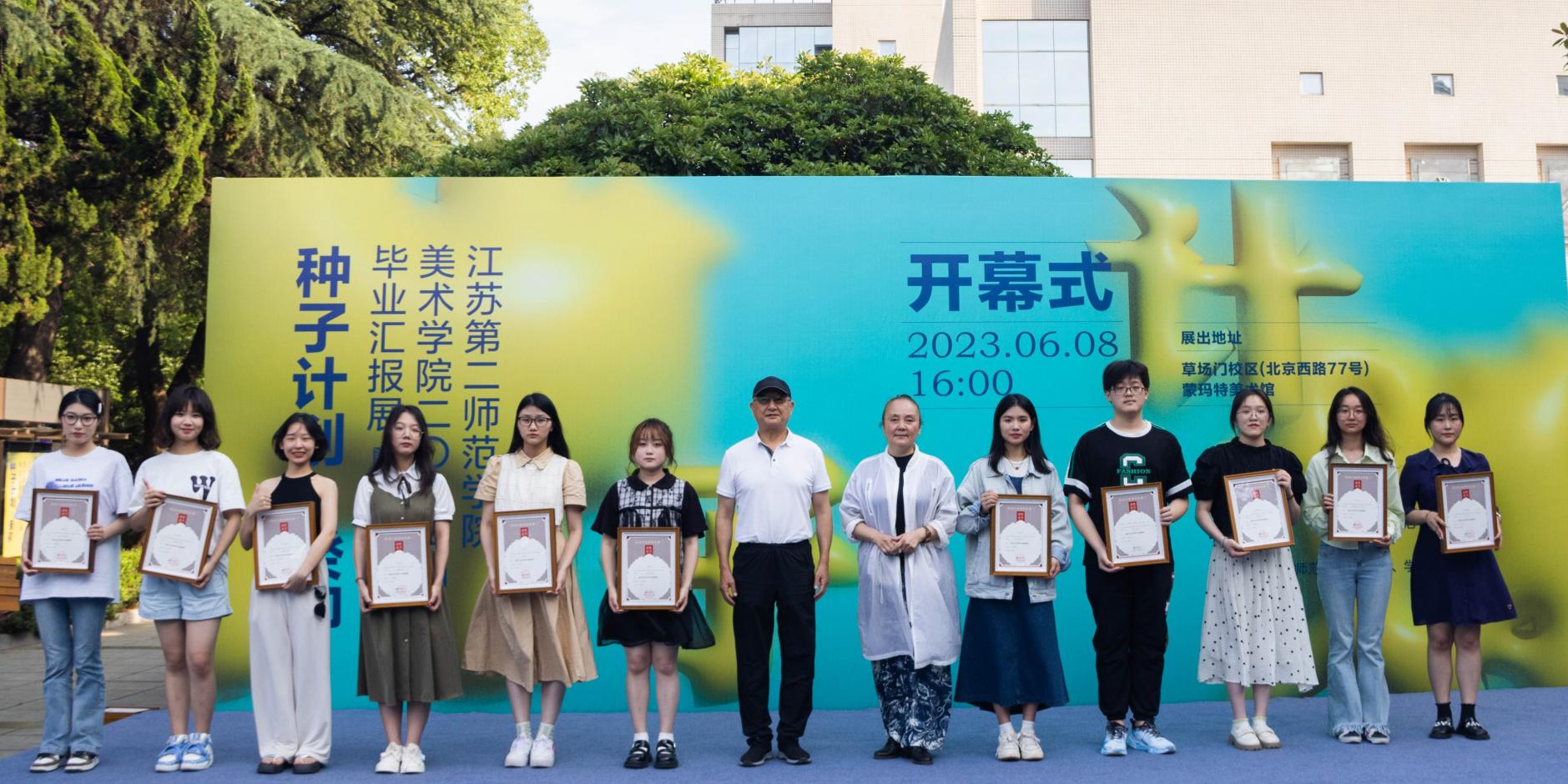 优秀毕业生代表、第11届江苏省师范生教学基本功大赛个人全能获得者侯佳一同学发言;美院教师代表、蒙玛特美术馆执行馆长李岩老师发言。江苏省美术家协会副主席、南京大学艺术学院副院长陆庆龙教授致辞,陆教授高度评价美院活跃的专业氛围,并期待毕业生能够多创作国家和人民需要的美术作品。之后,开幕式进入颁奖环节,第一项是黄显之艺术奖学金,由南京理工大学设计艺术与传媒学院院长徐伟教授宣读2023年度黄显之艺术奖学金收藏名单、优秀奖名单,黄载文教授、袁晓黎教授、封加樑教授和吕少卿教授分别为获奖同学颁发证书。第二项是蒙玛特学院奖,由杨思贤处长宣读2023年度蒙玛特学院奖获奖名单,由马先明先生、陈锋利先生为获奖学生颁发证书。