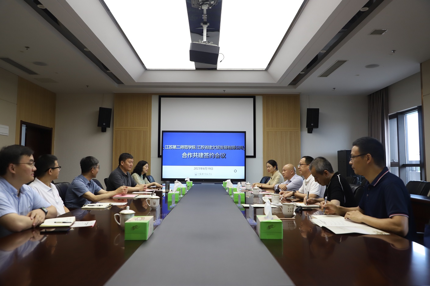 徐国华、谢如洲分别代表江苏第二师范学院与江苏省建文旅签署了校企合作共建协议,姚苏平、姚帅分别代表江苏第二师范学院文学院与江苏泓源旅游规划设计有限公司签署了合作共建“文旅研究院”的协议。