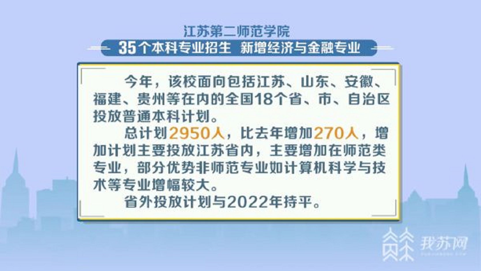 今年,该校面向包括江苏、山东、安徽、福建、贵州等在内的全国18个省、市、自治区投放普通本科计划。总计划2950人,比去年增加270人,增加计划主要投放江苏省内,主要增加在师范类专业,部分优势非师范专业如计算机科学与技术等专业增幅较大。省外投放计划与2022年持平。