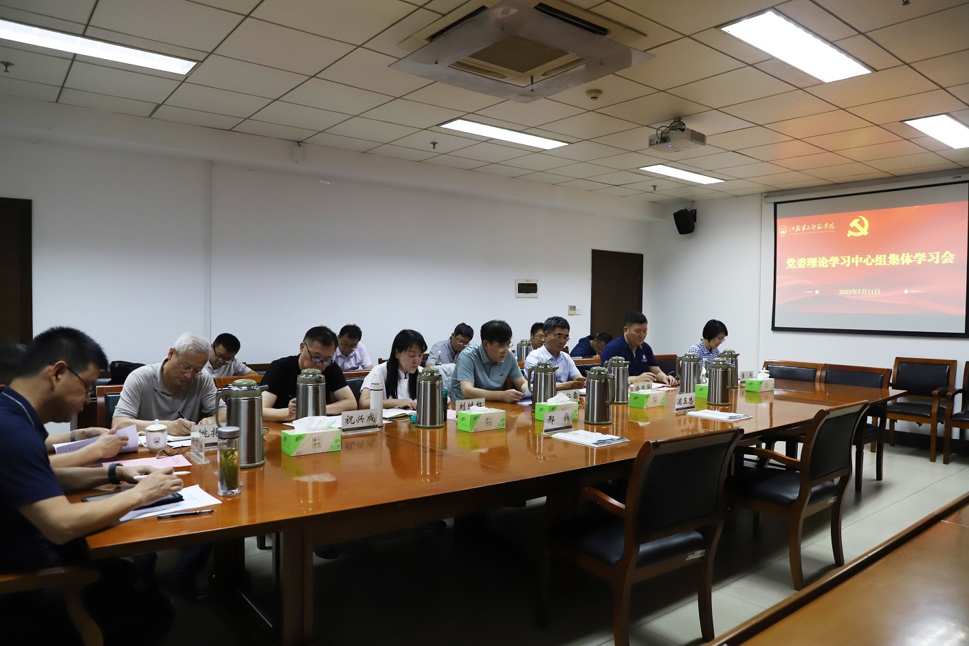 7月11日,党委书记王仁雷主持召开校党委理论学习中心组举行集体学习会,围绕学习贯彻习近平总书记在江苏考察时的重要讲话重要指示精神进行专题学习。全体在宁校领导、有关职能部门负责同志参加学习会。