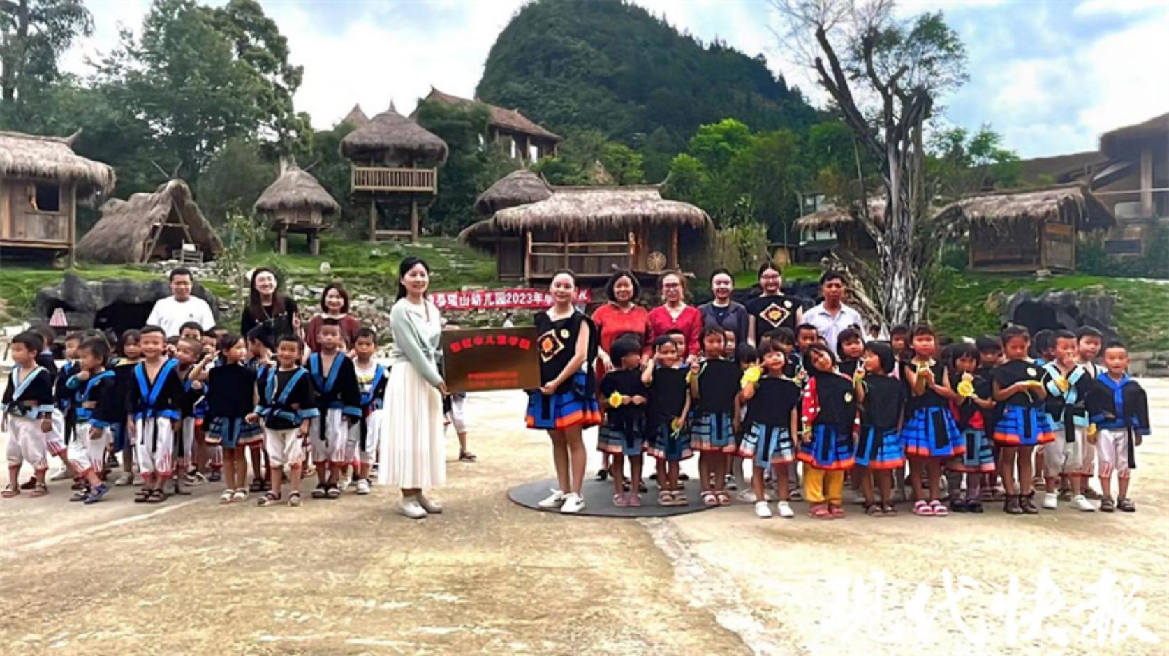 活动期间,王艳与荔波县瑶山幼儿园园长覃霞,共同为“彩虹伞•儿童学园”大学生社会实践基地揭牌,瑶山幼儿园获授为“彩虹伞•儿童学园”项目共建单位。