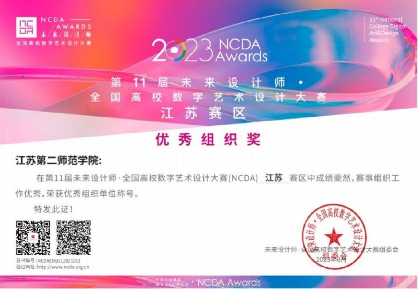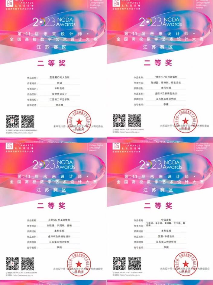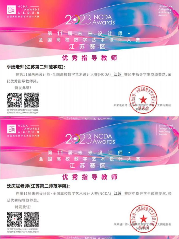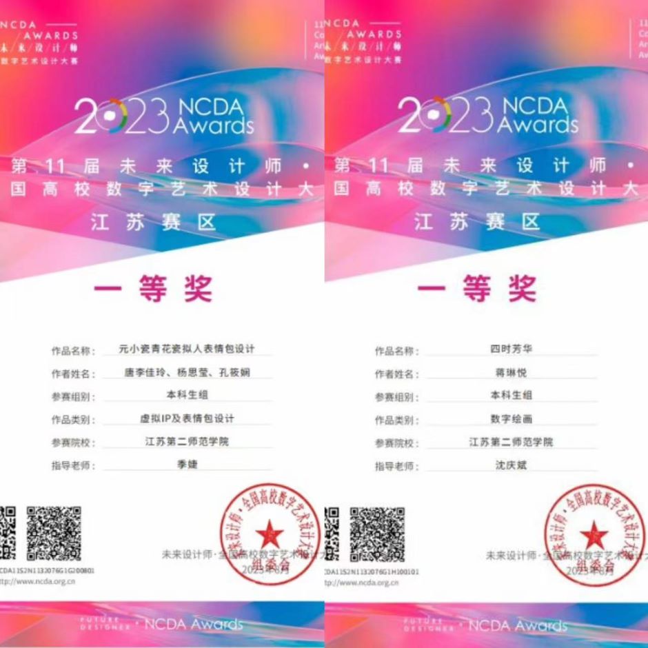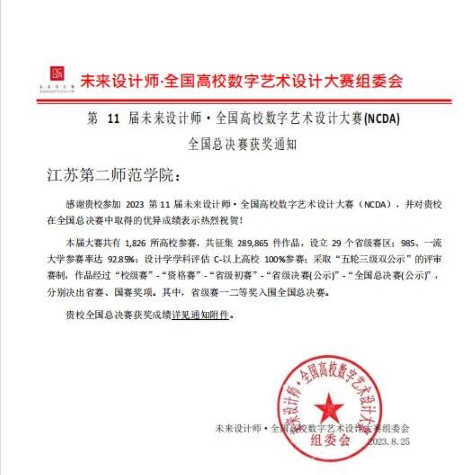 2023年6月,我院组织学生参加第11届未来设计师·全国高校数字艺术设计大赛(NCDA),经过激烈地角逐,比赛结果近期揭晓,传媒学院荣获国赛一等奖1项、二等奖1项,省赛一等奖2项、二等奖6项、三等奖3项。另外,季婕和沈庆斌两位教师荣获优秀指导教师奖,江苏第二师范学院荣获优秀组织单位奖。