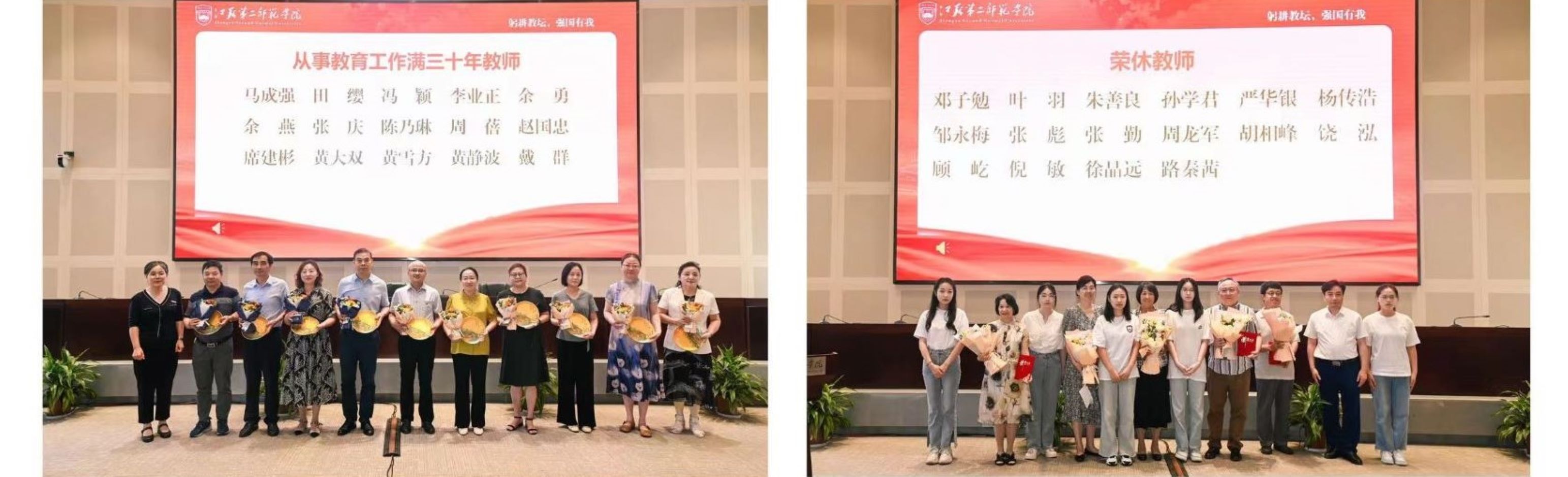 荣休教师代表邓子勉、从教30年教师代表张庆、国家级教学成果奖获奖代表尹坚勤发言。他们结合个人经历,回顾从教以来的辛勤印记,表达对学校支持个人发展的由衷感谢,展望学校高质量发展的远大前景。