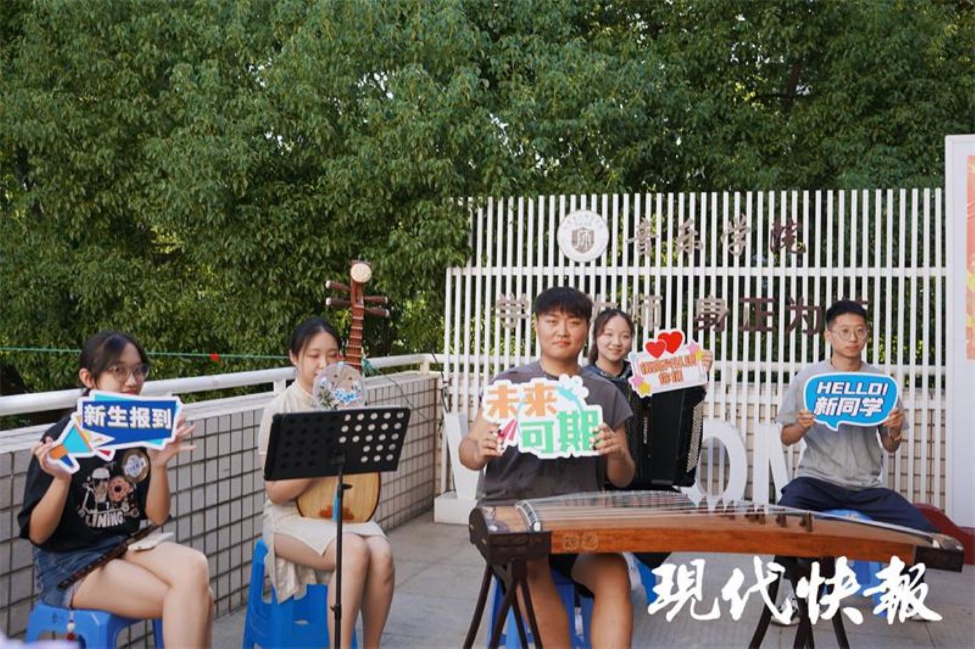 校园里,随处可见的迎新海报、展板、道旗营造了满满的氛围感。各二级学院设置了迎新点,其中音乐学院 曙光行动 志愿队在现场进行民乐表演,阵阵弦音悦耳。