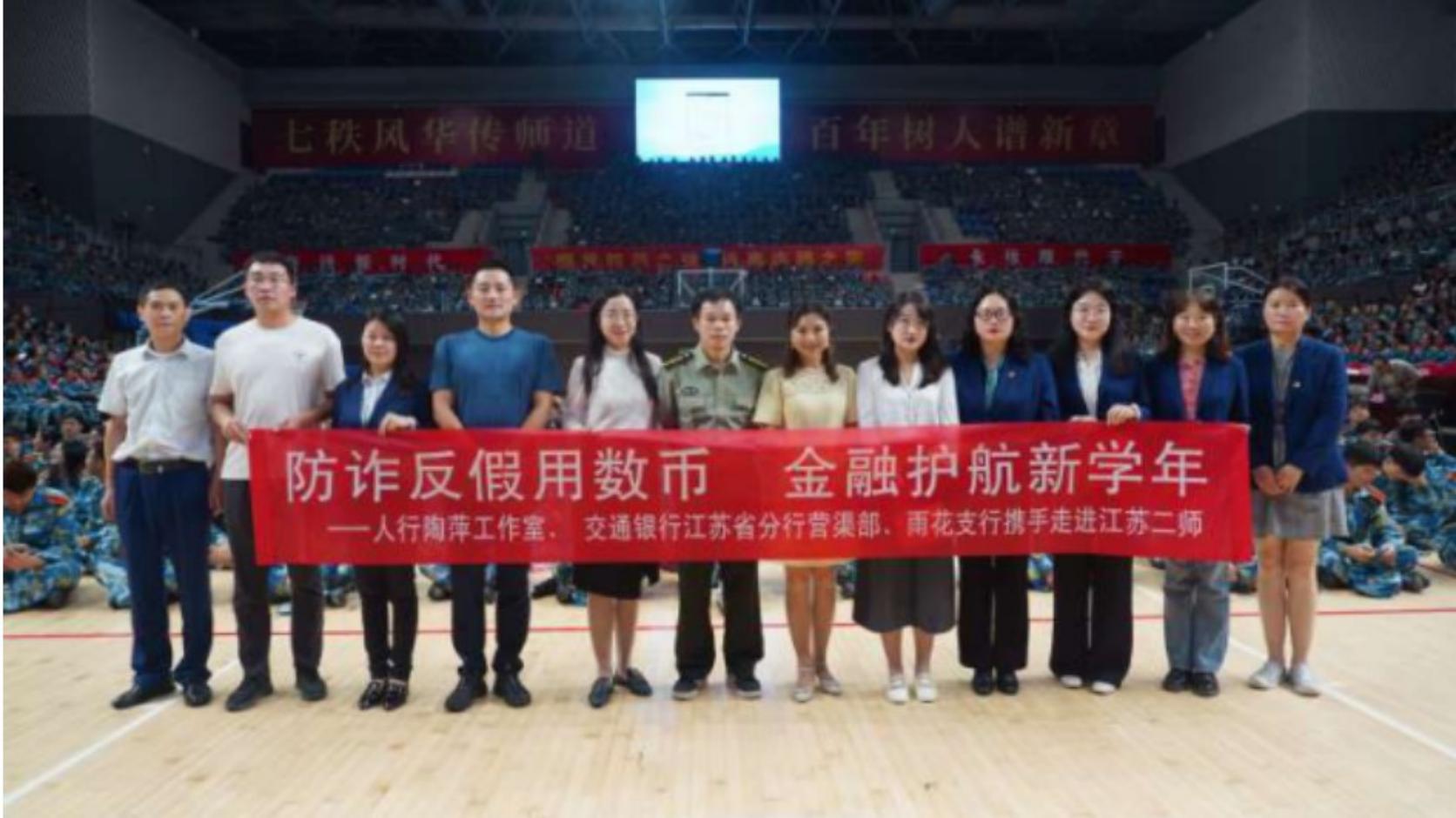 为切实提升在校大学生金融知识素养及风险防范意识,践行金融为民的理念,9月15日,交通银行江苏省分行营运与渠道部、雨花支行携手人行“陶萍工作室”走进江苏第二师范学院,为2700多名大一新生们上了一场别开生面的“防诈反假用数币 金融护航新学年”的安全教育课。中国人民银行陶萍专家、汤老师、陈老师和交通银行江苏省分行营渠部朱红军副总经理、雨花支行宋莹副行长,校学工处邵处、保卫处负责人等参加活动。