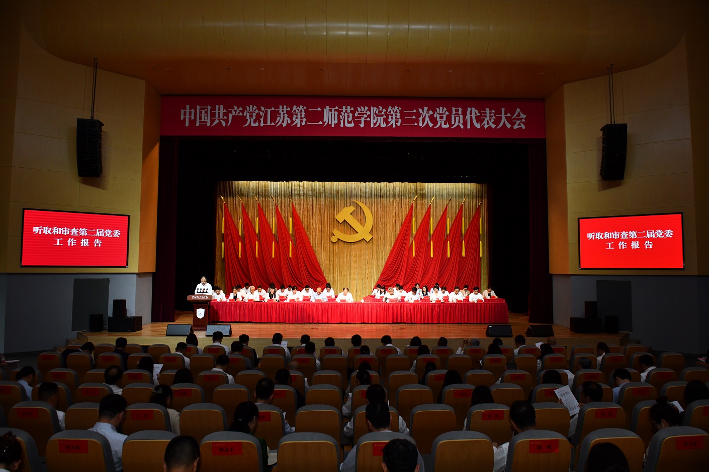 大会现场气氛庄严热烈。主席台上方悬挂“中国共产党江苏第二师范学院第三次党员代表大会”会标,金色的党徽在红旗的簇拥下熠熠生辉,会场后墙悬挂着“高举习近平新时代中国特色社会主义思想伟大旗帜,奋力开启特色鲜明高水平大学建设新征程”的大幅标语,振奋人心,催人奋进。全校党代表汇聚一堂,凝心聚力,共商学校发展和党的建设大计。