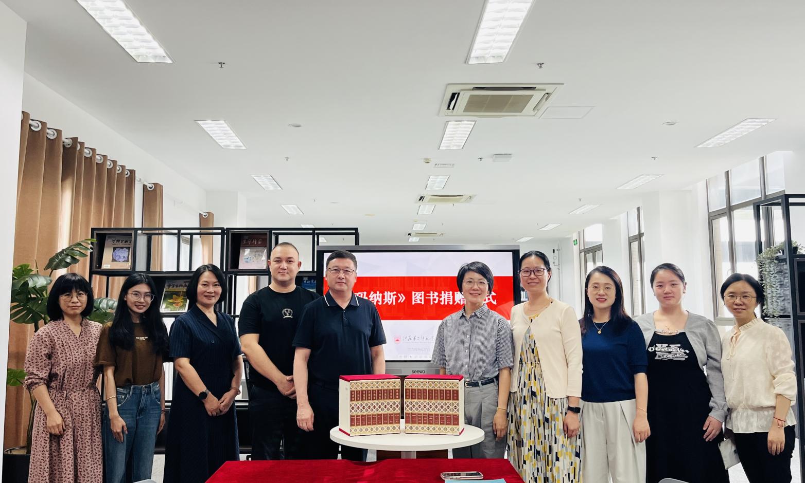 地里下提·特莱西向江苏第二师范学院赠送民族史诗《玛纳斯》一套8部18卷,施雁冰代表江苏第二师范学院图书馆为其颁发了捐赠证书。