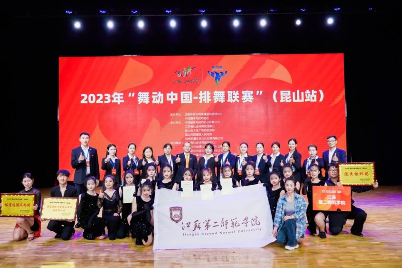 经过两天激烈的角逐,我校排舞队获得特等奖七项,一等奖四项,二等奖一项的好成绩,最终获得高校普通院校小集体团体总分第一名的好成绩以及优秀组织奖、体育道德风尚奖。我校作为江苏省首所排舞五星级示范学校,要勇担新时代使命任务,把我国建设成体育强国而努力。