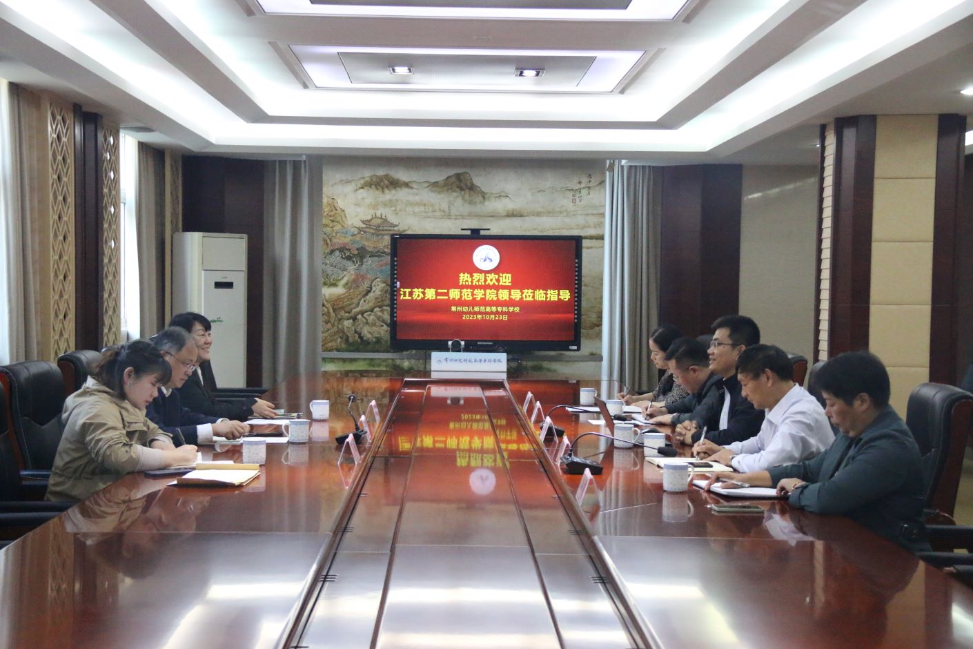 在常州幼儿师范高等专科学校,王鲁沛一行出席座谈会,与市教育局副局长王华刚、常州幼专校长肖加平等展开深入交流。
