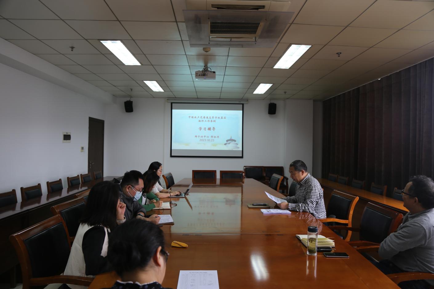全体人员会议结束后,党员及中心组成员在邵红军书记的带领下,又一次学习了党章和《中国共产党普通高等学校基层组织工作条例》。邵书记结合新旧党章的不同之处以及《中国共产党普通高等学校基层组织工作条例》的具体内容,做了较为详细的辅导讲话。