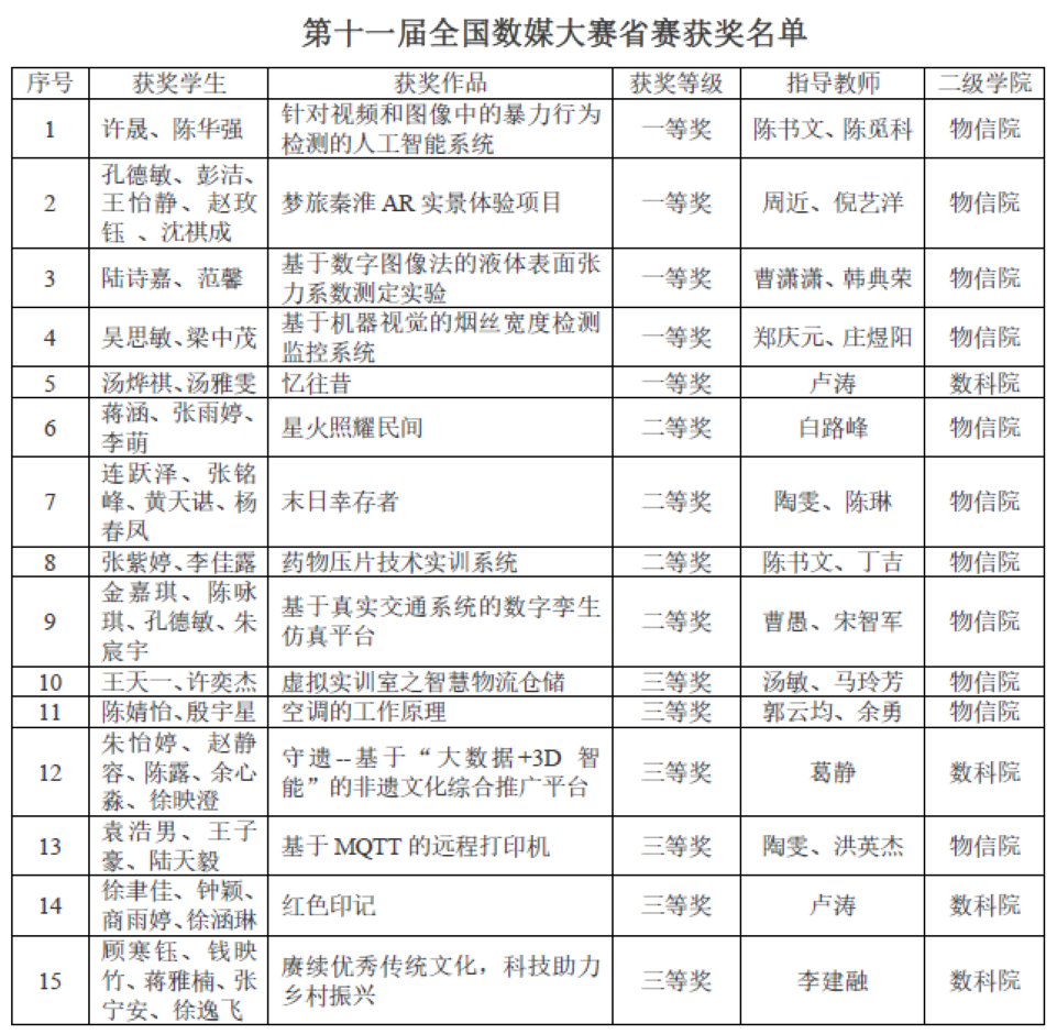 全国数媒大赛入选2023年中国高等教育学会学科竞赛排行榜单,已成为引领大学生创新创业、实践技能提升的科技与艺术融合的重要赛项。我校第一次组队参加本届赛事,优秀成绩的取得彰显了我校计算机科学与技术、数学与应用数学两个国家级一流本科专业建设点的育人成效。