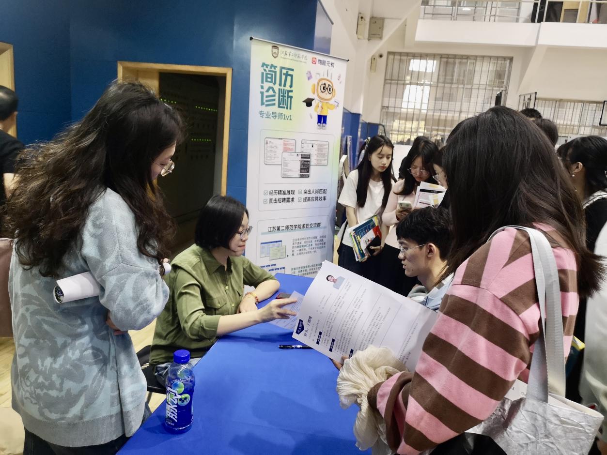 本次招聘会内容上充分体现了我校师范特色,形式上推陈出新,设置了“简历门诊”专区及“校园招聘洽谈区”。“简历门诊”邀请到前程无忧职场导师、国家一级人力资源管理师、职业生涯规划师陈玥现场坐诊,为毕业生简历撰写提供了专业化、专家化的指导服务,更好地助力毕业生求职应聘。“校园招聘洽谈区”布置清新,为用人单位与毕业生及二级学院提供了深入交流的闲静场地,为用人单位现场面试、校企交流等提供便利。江苏电视台、现代快报等多家媒体对我校此次招聘会进行了采访报道。
