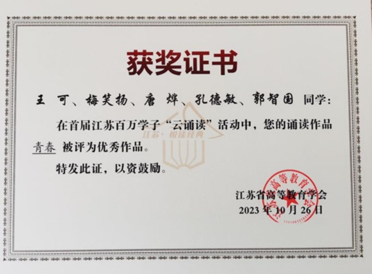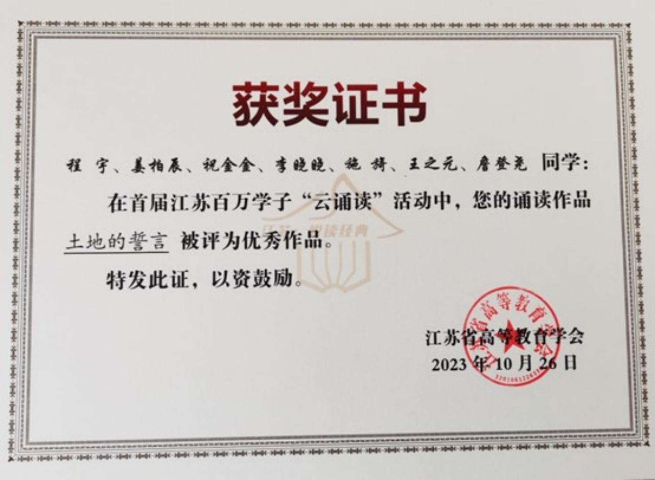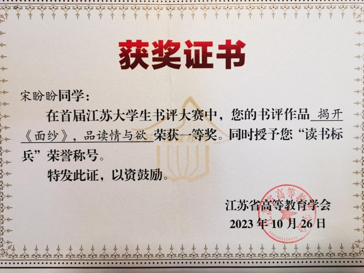 我院宋盼盼同学的书评作品《揭开〈面纱〉,品读情与欲》,获首届江苏大学生书评大赛一等奖,王越、朱昱霏、李硕、郑英四位同学获二等奖。我院程宇等同学排演的《土地的誓言》、王可等同学排演的《青春》两部朗诵作品入选首届江苏百万学子“云诵读”优秀作品。