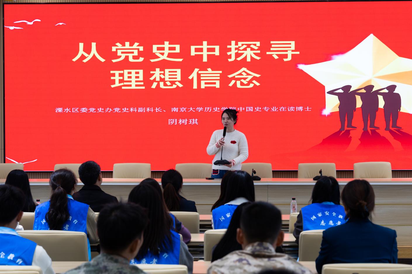在瞻仰了铜山战斗群像后,同学们在带队老师和退伍大学生的带领下翻越了铜山山岗小道,以抵达溧水曹庄生态园,南京溧水区党史办阴树琪副科长我校师生上了一堂以“从党史探寻理想信念”为主题的微党课,她以同龄人的身份引入、从自身党史学习经历、人生选择心态、基层工作感悟、理想信念树立等方面进行讲述,引导同学们青春勇于奉献,坚定理想信念,并鼓励同学们“每个人都有独特的目标与价值,一步一个脚印地认真走下去,我们都会成为最好的自己”,进一步唤起了同学们的奋斗激情。