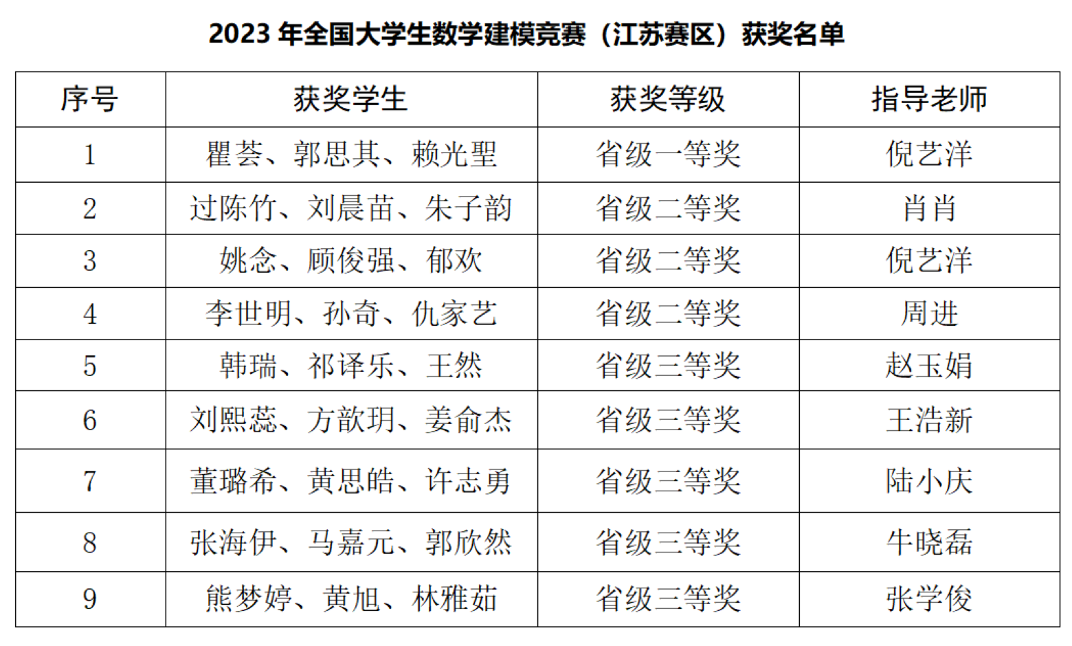 2023年“高教社杯”全国大学生数学建模竞赛江苏赛区获奖名单于近日公布,我校学子喜获省级一等奖1项,二等奖3项,三等奖5项。
