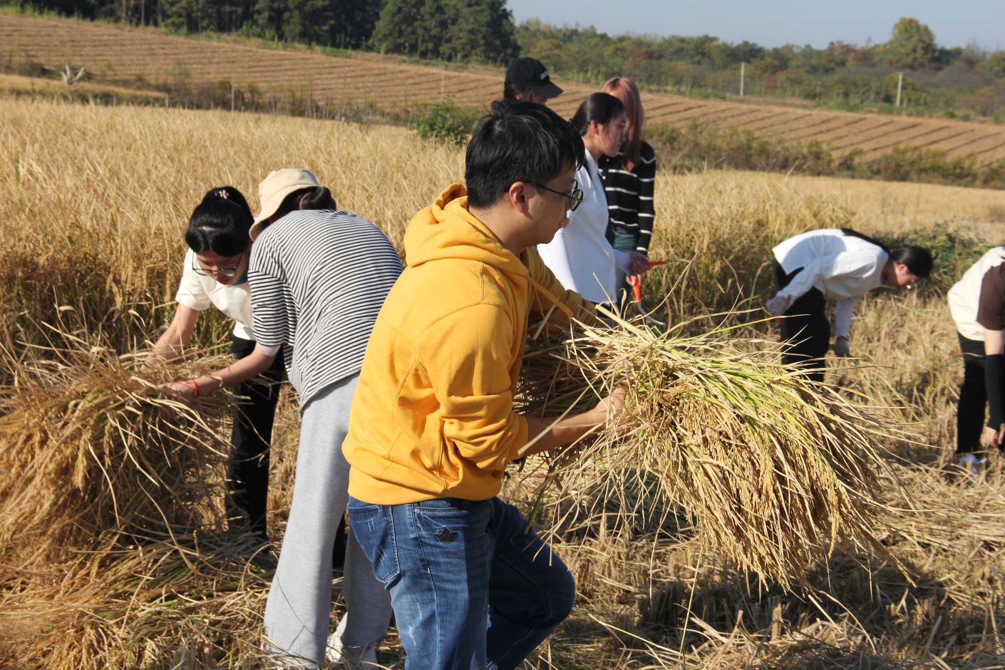 在金黄色的稻田里,先锋队队员们挽起衣袖、俯下身子、一边收割一边捆扎,充分发扬“不怕苦、不怕累、不怕脏”的精神,个个干劲十足,穿梭在田间地头。你割稻、我搬运……大家忙得热火朝天、不亦乐乎,田地间呈现出一片农忙的景象。虽然累得满头大汗,但看着收获的稻谷,同学们的脸上都挂满了笑容,内心充满了丰收的喜悦。