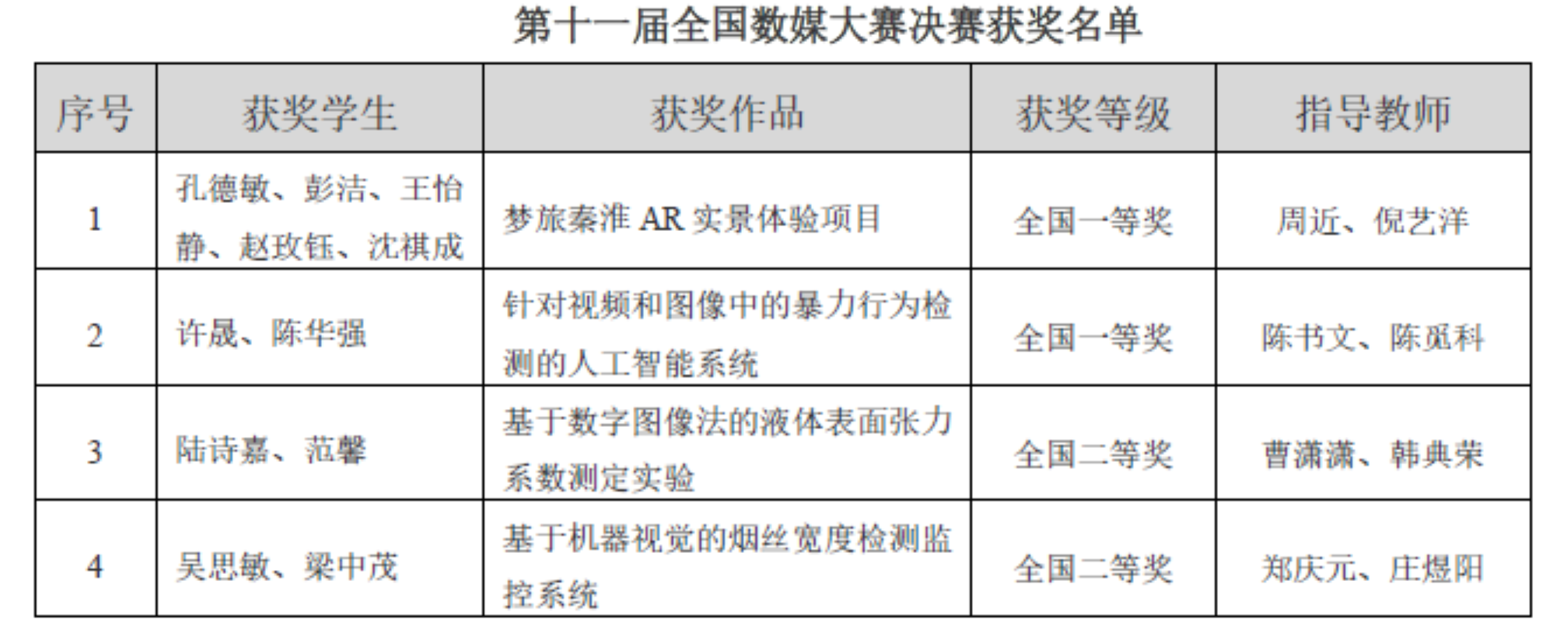 我院教师周近和倪艺洋指导的作品《梦旅秦淮AR实景体验项目》、陈书文和陈觅科指导的作品《针对视频和图像中的暴力行为检测的人工智能系统》分获国赛一等奖;曹潇潇和韩典荣指导的作品《基于数字图像法的液体表面张力系数测定实验》、郑庆元和庄煜阳指导的作品《基于机器视觉的烟丝宽度检测监控系统》分获国赛二等奖。