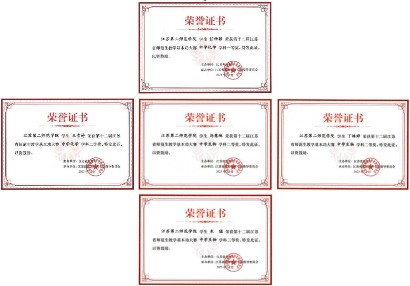 近日,由江苏省教育厅主办,江苏省教师教育专业指导委员会承办的第十二届江苏省师范生教学基本功大赛落下帷幕,生化学院学子在中学化学组和中学生物组的比赛中再获佳绩,共获得一等奖1项,二等奖3项,三等奖1项。
