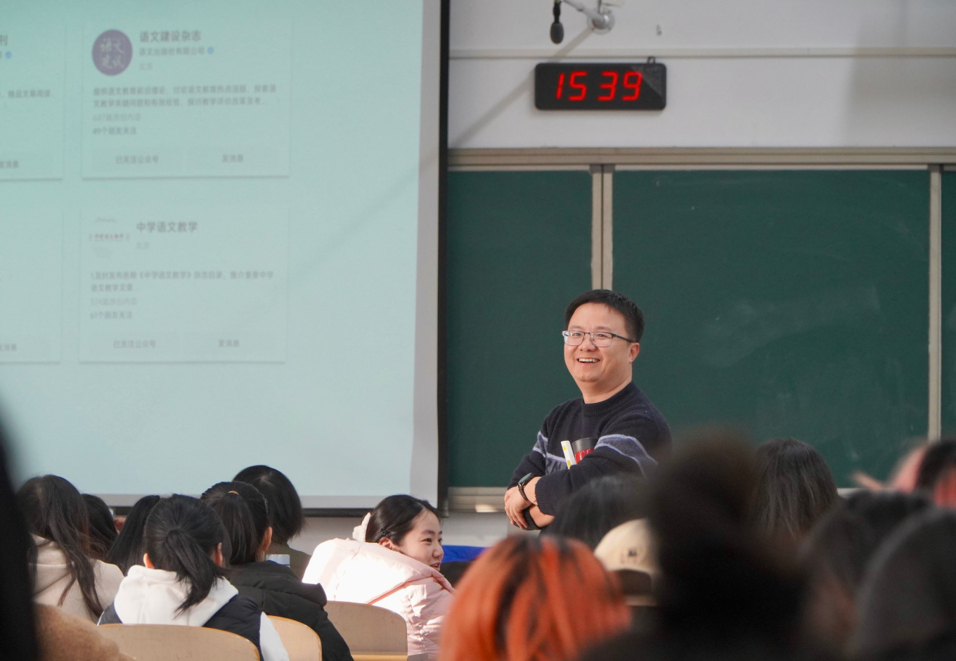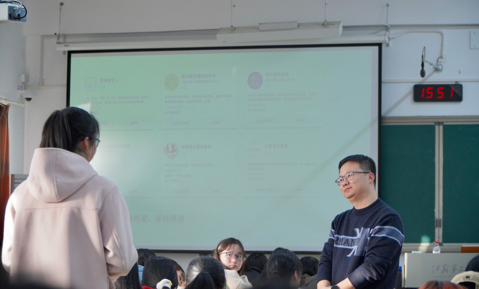 在师范生基本功训练方面,何欣向学生详细介绍了教学设计撰写的规则,教学重难点和板书设计的技巧等,希望学生注重文字表达能力与信息技术能力的锻炼。同时提出要注重培养行政管理、特色化职业、教师教学专业和德育管理四个能力。