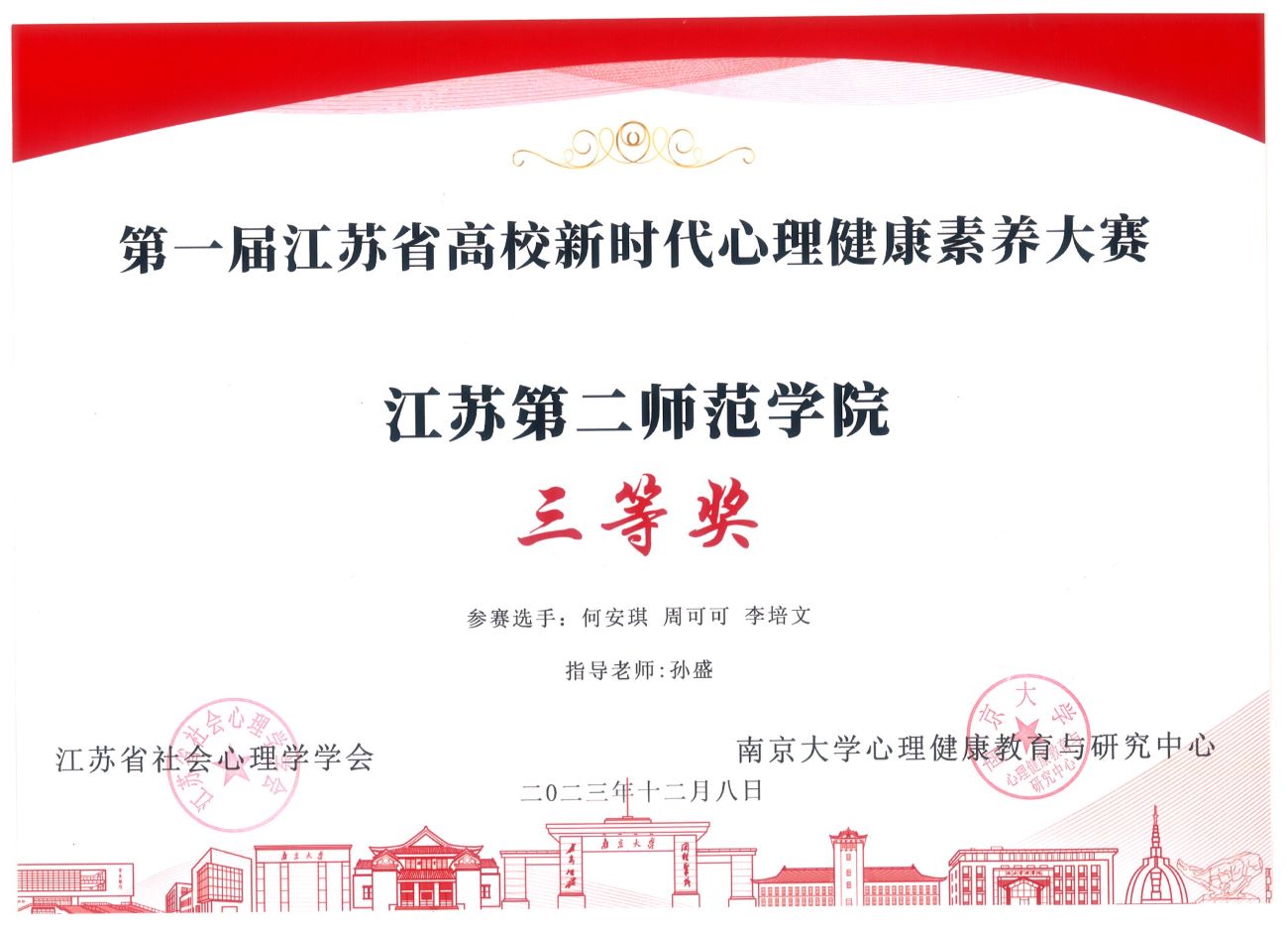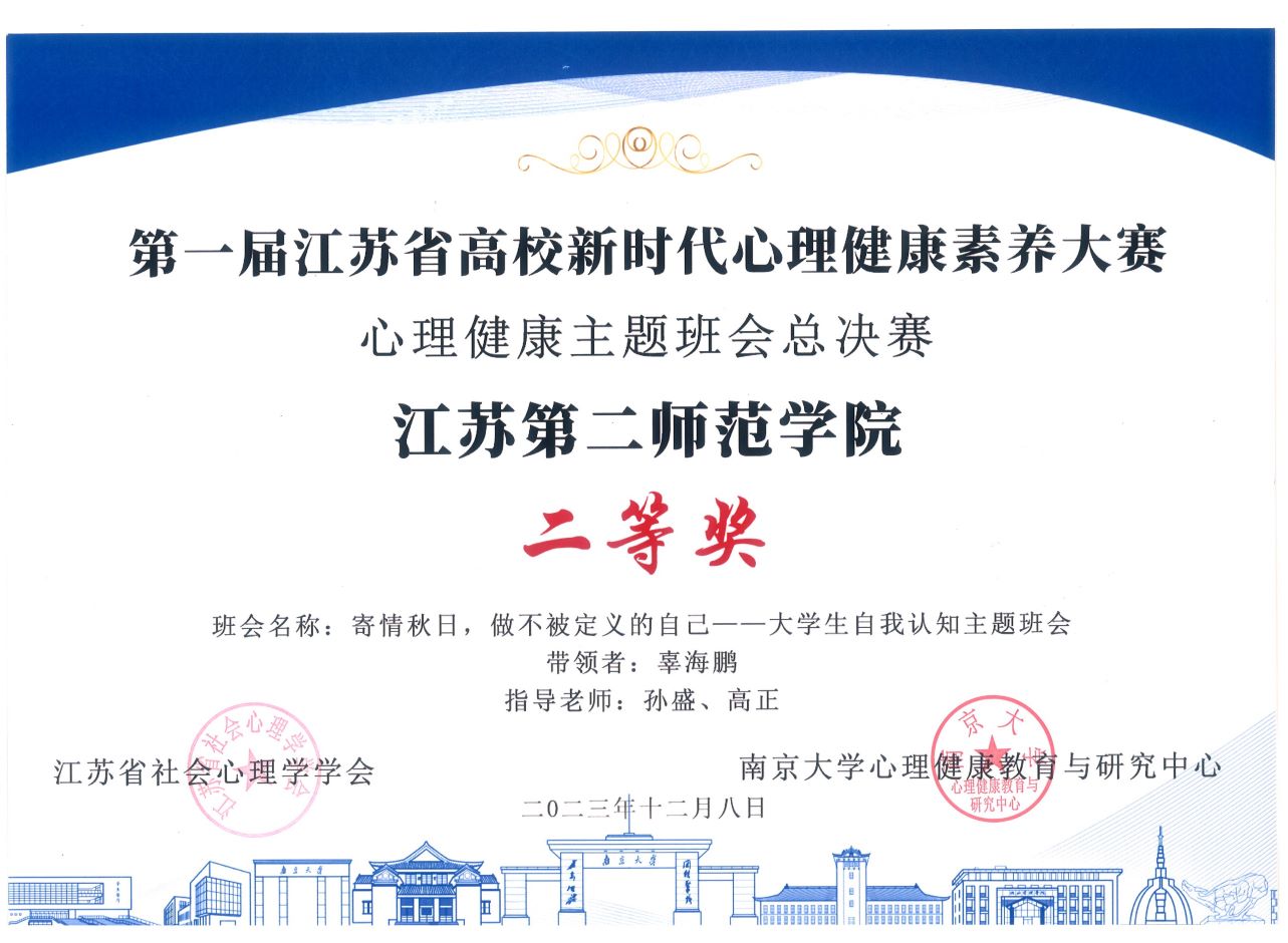 12月8日上午,第一届江苏省高校新时代心理健康素养大赛总决赛(暨颁奖典礼)在南京大学仙林校区国际会议中心举行。本次大赛由南京大学心理健康教育与研究中心、江苏省社会心理学学会共同举办,我校报名参加的心理健康主题班会竞赛、心理健康知识竞赛分获二等奖与三等奖。