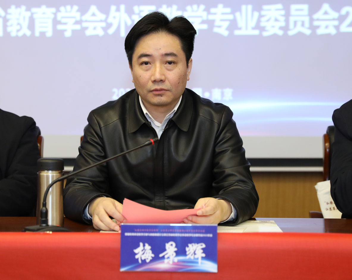 梅景辉首先代表江苏第二师范学院致辞,介绍了江苏第二师范学院事业发展历程以及学科专业、人才培养、社会服务等方面的成就。他指出,随着中国特色社会主义进入新时代,外语教育服务“一带一路”建设和推动“构建人类命运共同体”的使命更加彰显。他从“语言作为一种交流工具和语言教育作为提升人的素质能力之间的根本区别”以及“每一种语言都包含着独特的世界观”的哲学高度,阐述了本次会议的重大意义和江苏第二师范学院在转设普通本科高校十周年之际承办本次会议的光荣使命。高等教育与基础教育无缝对接,要为弘扬和践行教育家精神奠定思想基础,为中华民族伟大复兴培养具有国际传播力的时代新人筑牢实践根基。