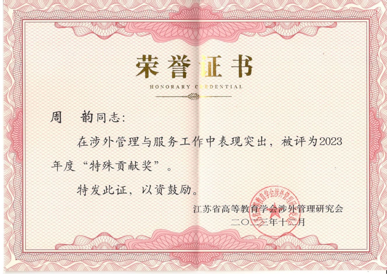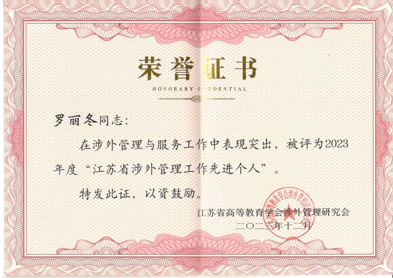 我校国际合作与交流处综合管理科科长罗丽冬荣获2023年度“江苏涉外管理先进个人”荣誉称号,前任国际合作与交流处处长周韵荣获“特殊贡献奖”。