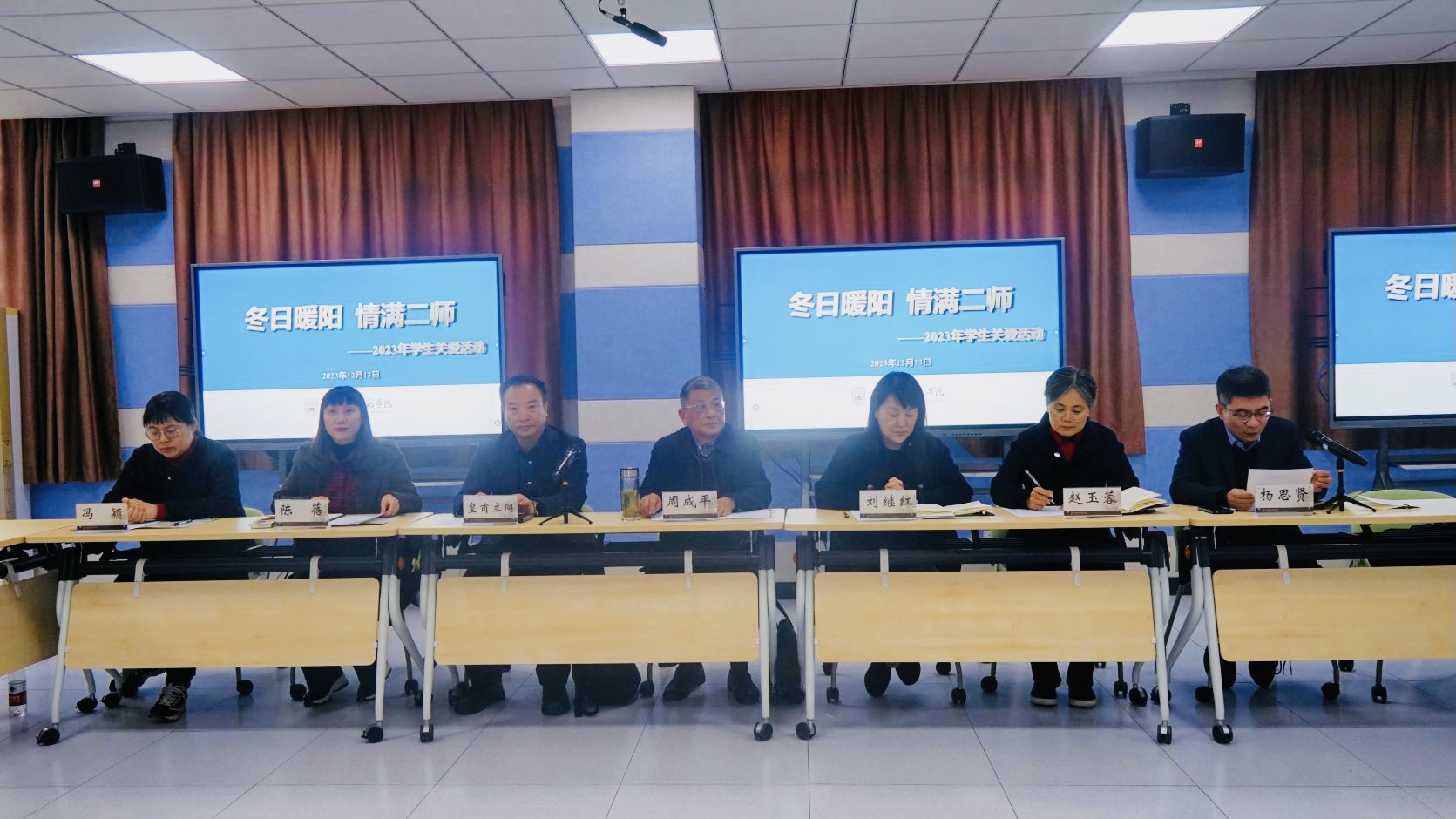 岁末寒风起,学子总关情。12月13日下午,在石湫校区崇文楼2-414会议室,党委学工部联合党委统战部、校关心下一代工作委员会和离退休工作处,共同举办“冬日暖阳 情满二师”——2023年学生关爱活动。党委副书记、副校长刘继红,党委常委、副校长皇甫立同,党委常委、副校长赵玉蓉,校关心下一代工作委员会常务副主任周成平,党委常委、统战部长、质评处长陈蓓,党委常委、组织部长、学工部长杨思贤出席。相关职能部门负责人和30余名退役大学生、少数民族学生、家庭经济困难学生代表参会。活动由杨思贤主持。