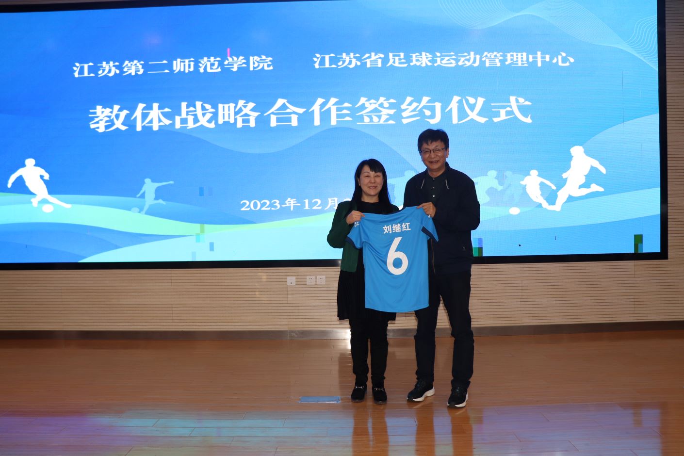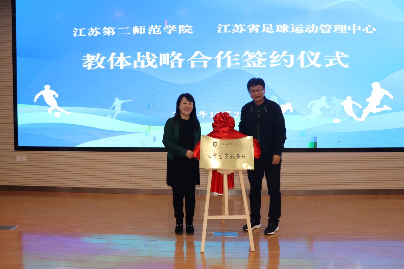仪式上,戴海光与江峰分别代表双方签订了战略合作协议。刘彤向刘继红赠送了江苏女足荣誉球衣,并共同为我校大学生实践基地揭牌。
