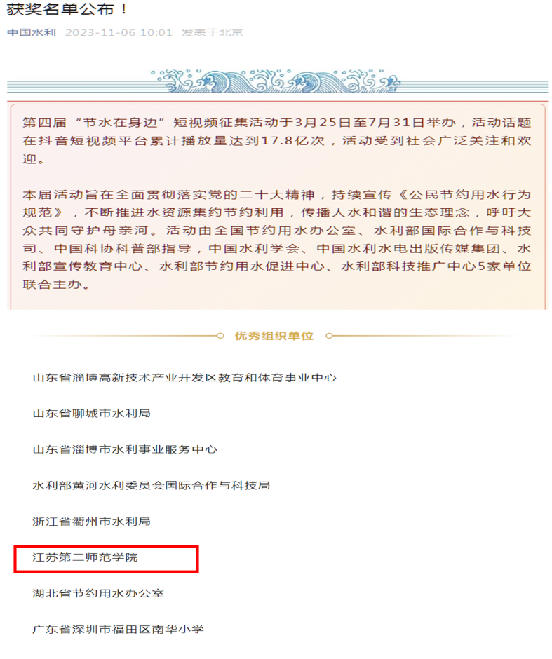 1.我校在全国节约用水办公室、水利部国际合作与科技司等5家单位组织的第四届“节水在身边”短视频征集活动中获优秀组织单位