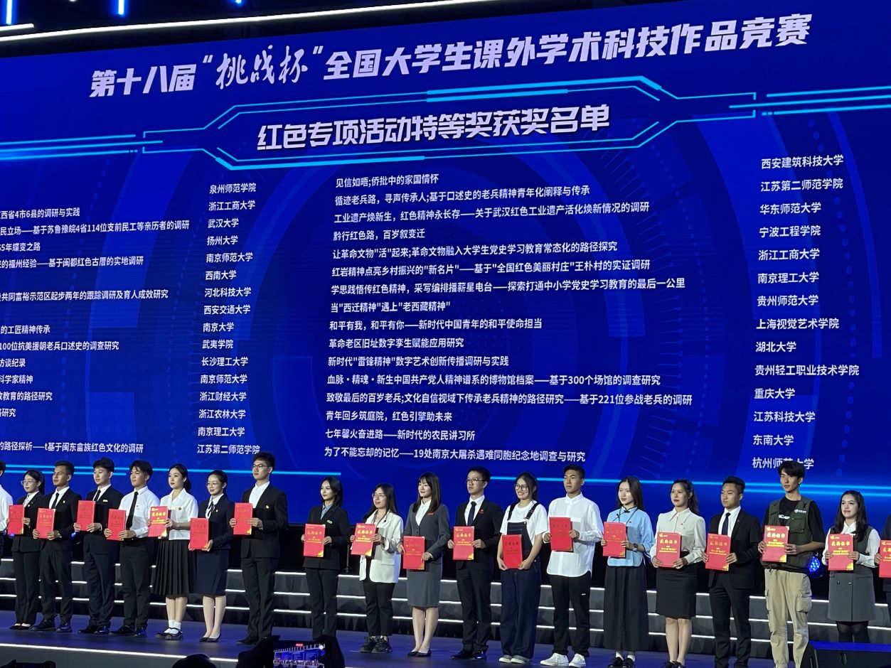 我校传媒学院《为了不能忘却的记忆——19处南京大屠杀遇难同胞纪念地调查与研究》和学前教育学院《童归乡野 “麦”续百年——基于“彩虹伞”乡村儿童志愿服务团队发展十年的田野调研》获得第十八届“挑战杯”全国红色专项比赛特等奖!实现该项目奖项零突破和重大突破!