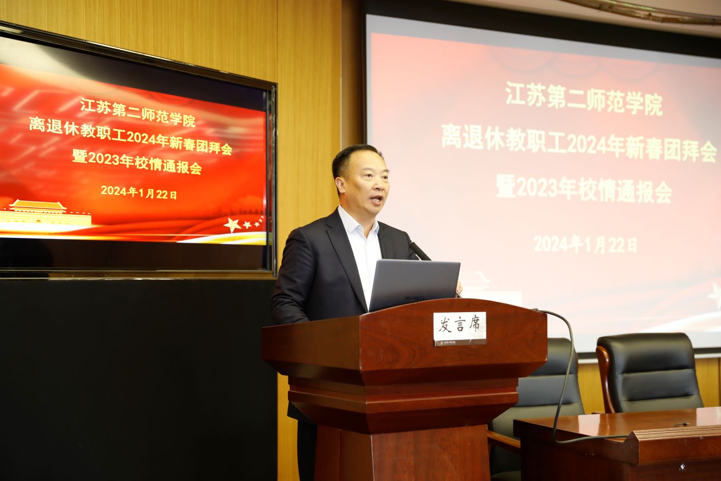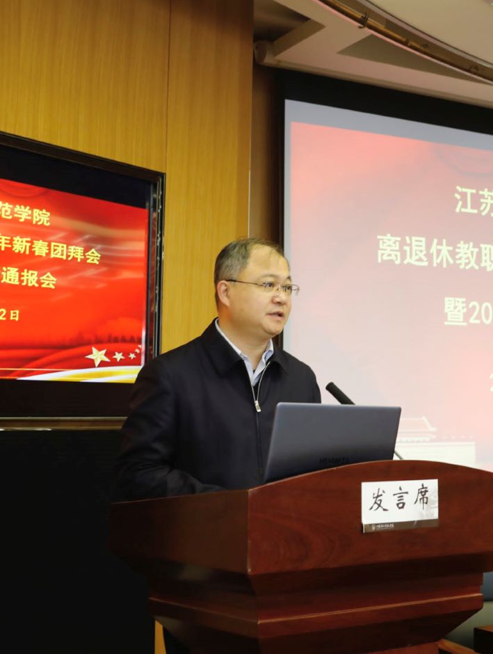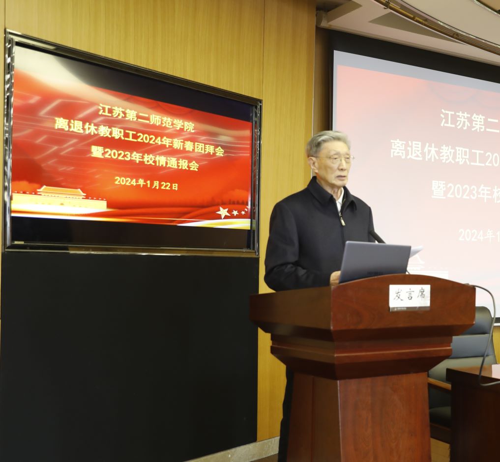 1月22日上午,学校在草场门校区教育技术楼二楼报告厅举行离退休教职工2024年新春团拜会暨2023年校情通报会。校党委书记王鲁沛、校党委常委、副校长姚振标、皇甫立同、花书贵和退休校领导及离退休老同志代表共计170余人欢聚一堂。
