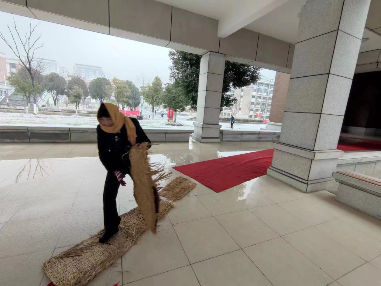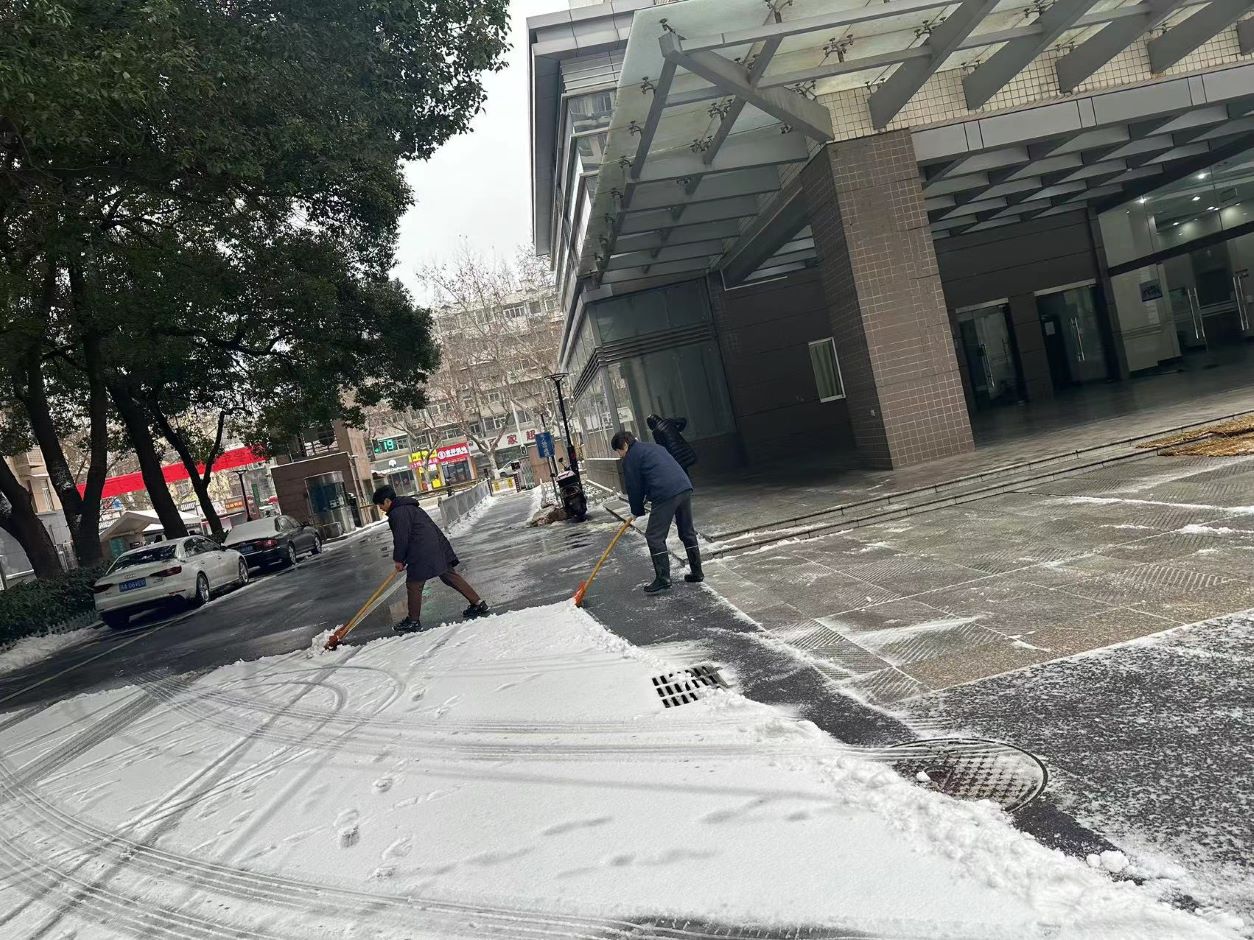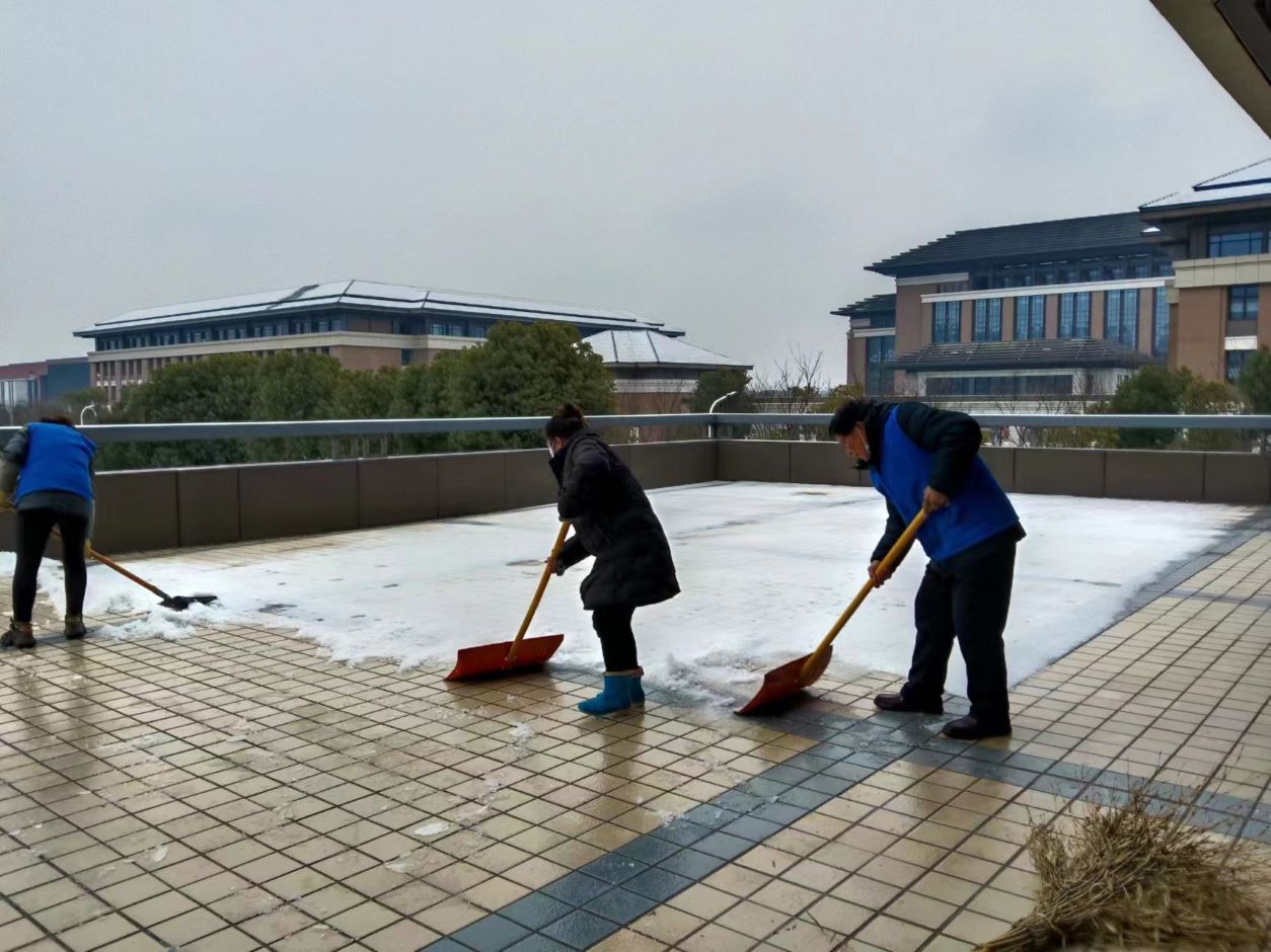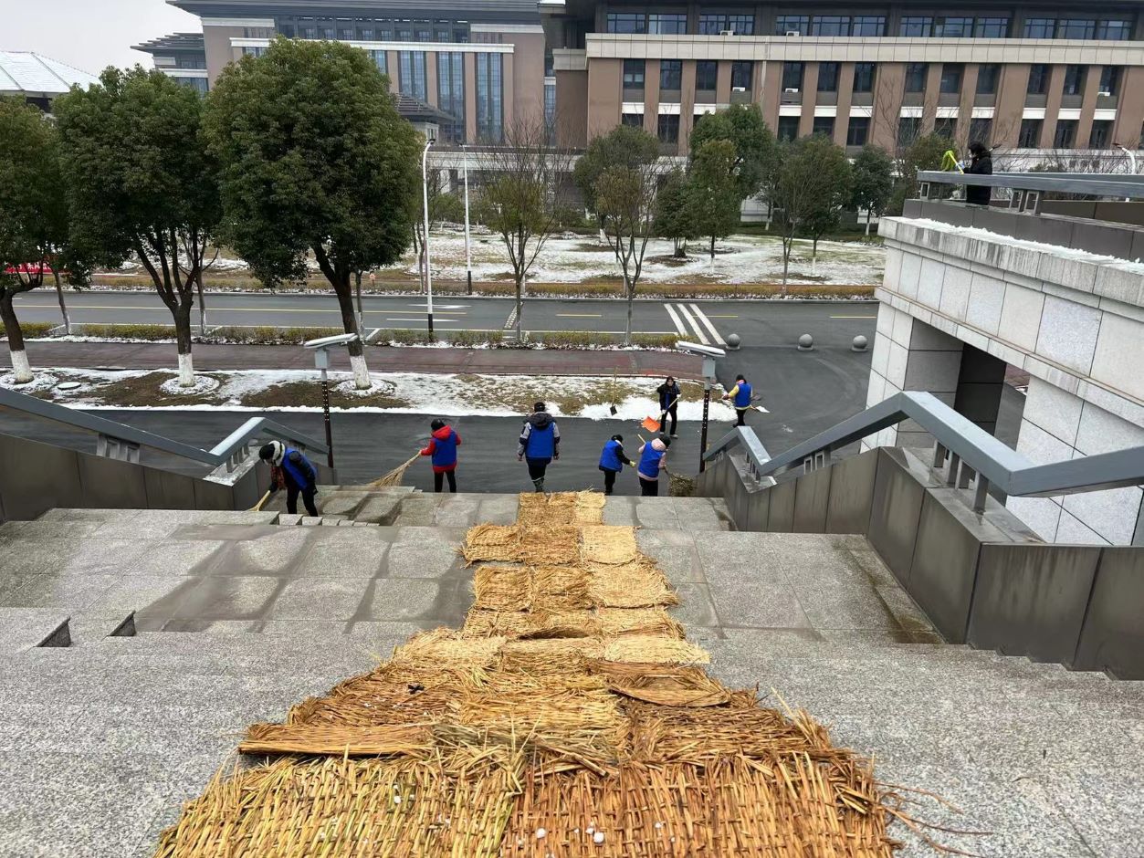 9时45分,各组人员基本完成主要路段冰雪清除工作。在各楼宇门前、教学楼连廊和室外平台等重点区域采用人工铲雪、设置警示标志、铺设防滑垫和撒布融雪剂等方式,对易结冰上冻地段进行融雪除冰工作。