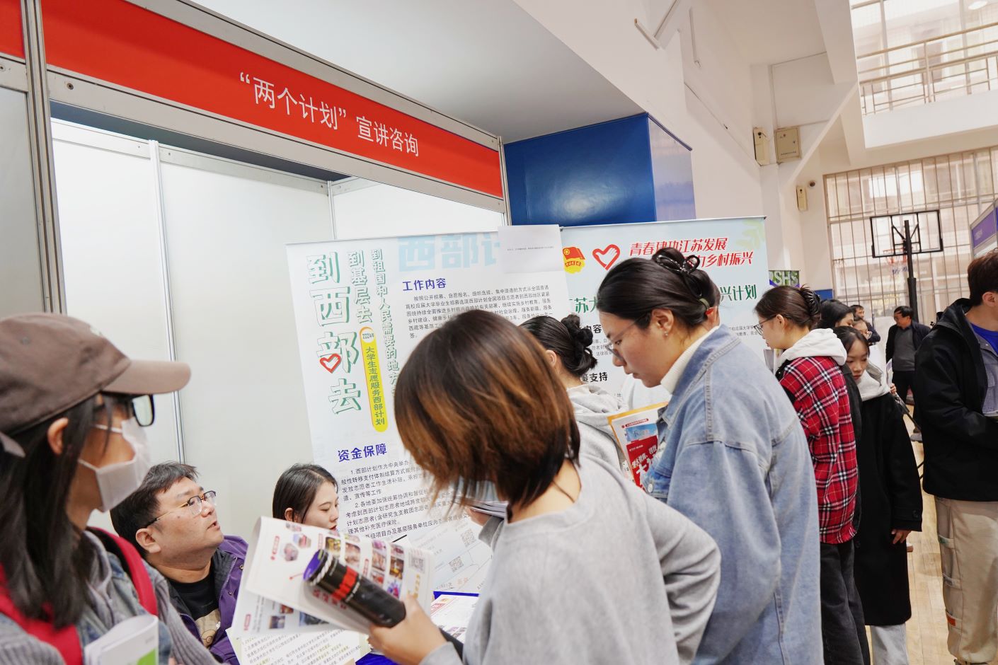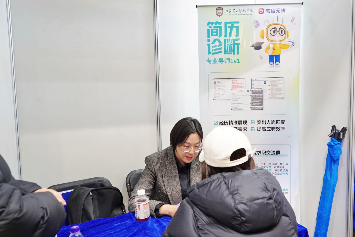 招聘会活动现场专门设置了简历门诊、“两个计划”宣讲咨询、服务台、金融政策咨询台等,为毕业生提供贴心“一站式”就业服务。“简历门诊”邀请到国家一级人力资源管理师、职业生涯规划师陈玥“把脉开方”,为毕业生简历撰写提供专业化的指导服务。“两个计划”宣讲咨询由校团委现场解答相关政策。